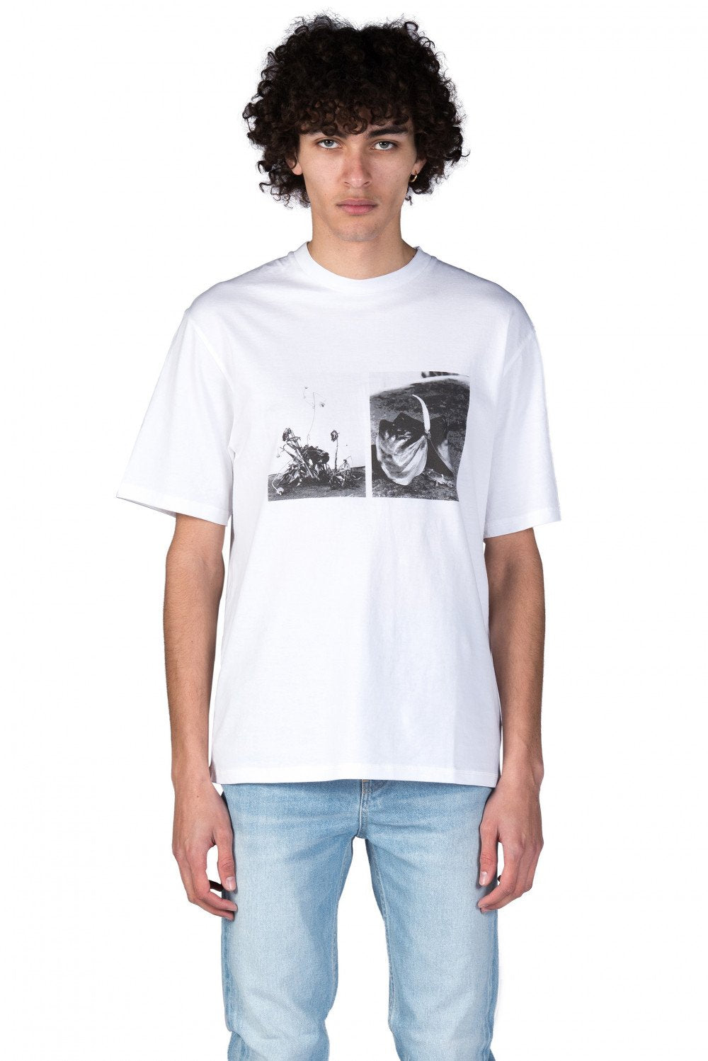 Rib knit crewneck collar. Graphic printed in tones of black and grey at front. Tonal stitching