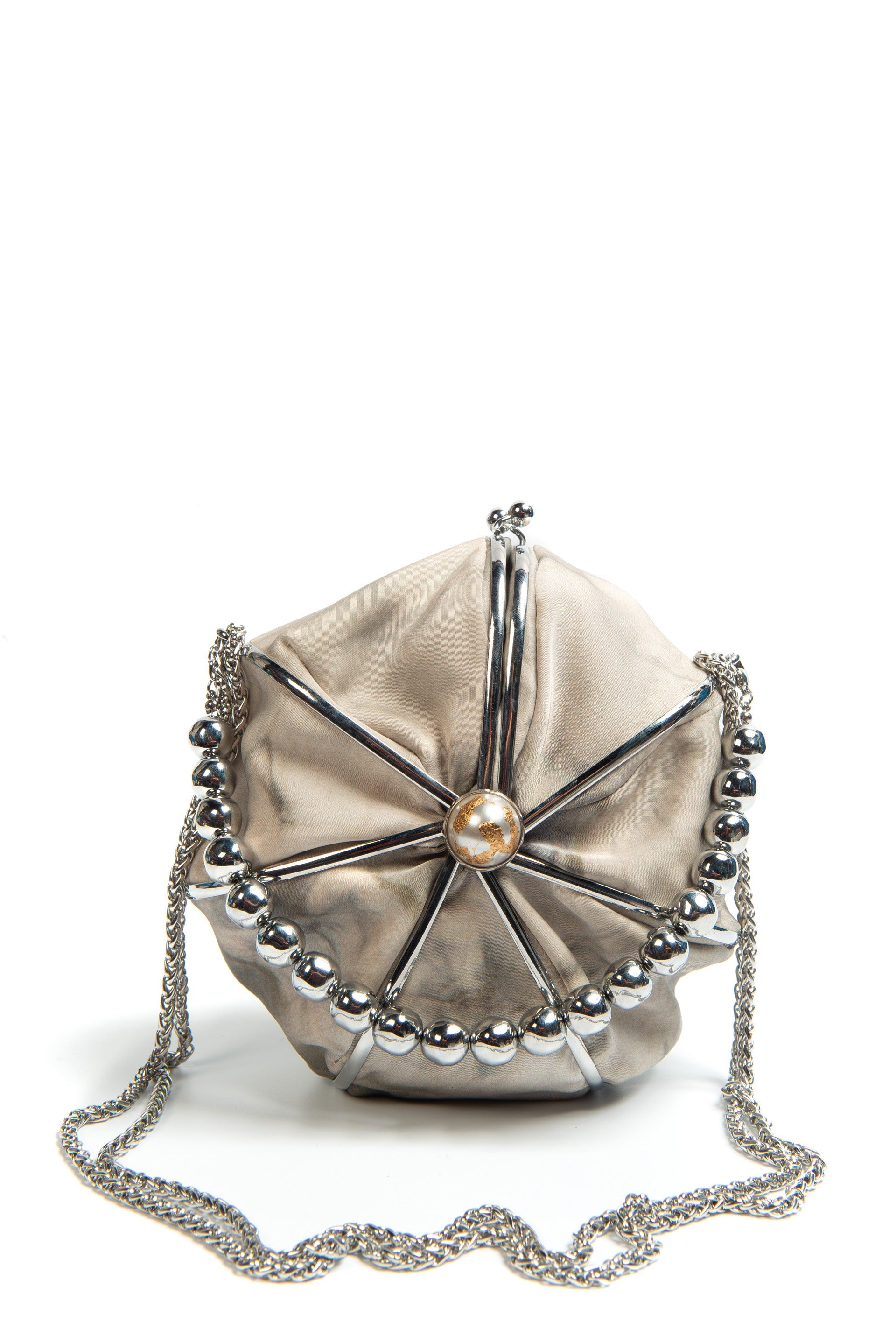 Clasp closure at top. Silk lining with drawstrings closure inside. Pearl handle and metallic strap.