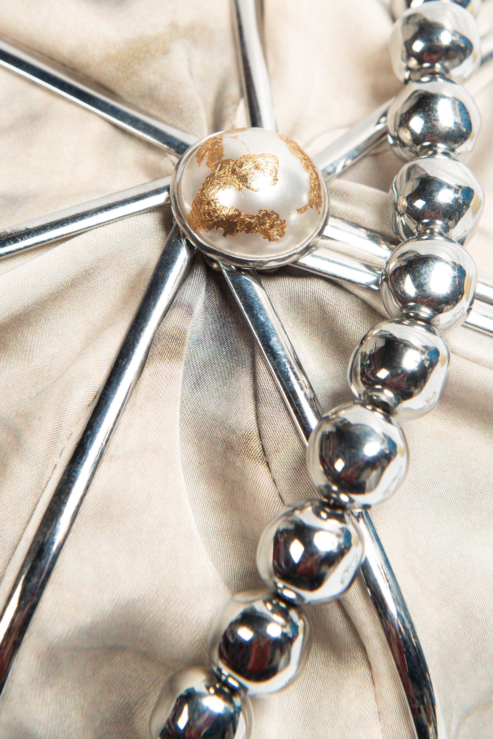 Peng Tai creates modern silhouette with traditional chinese philosophy. Inspired by how Chinese herbal medicine regulates the body from the inside out, Peng Tai aims to research and develop a way to boil Chinese herbal medicine with fabrics, to create clothes that feel like a second skin as seen with the White Silver Dyed Mesh Umbrella Purse.