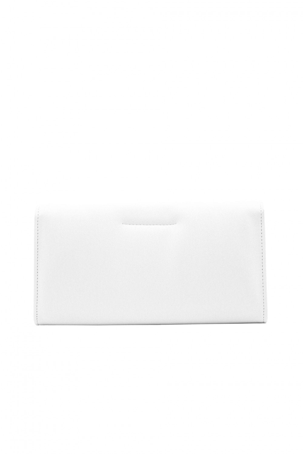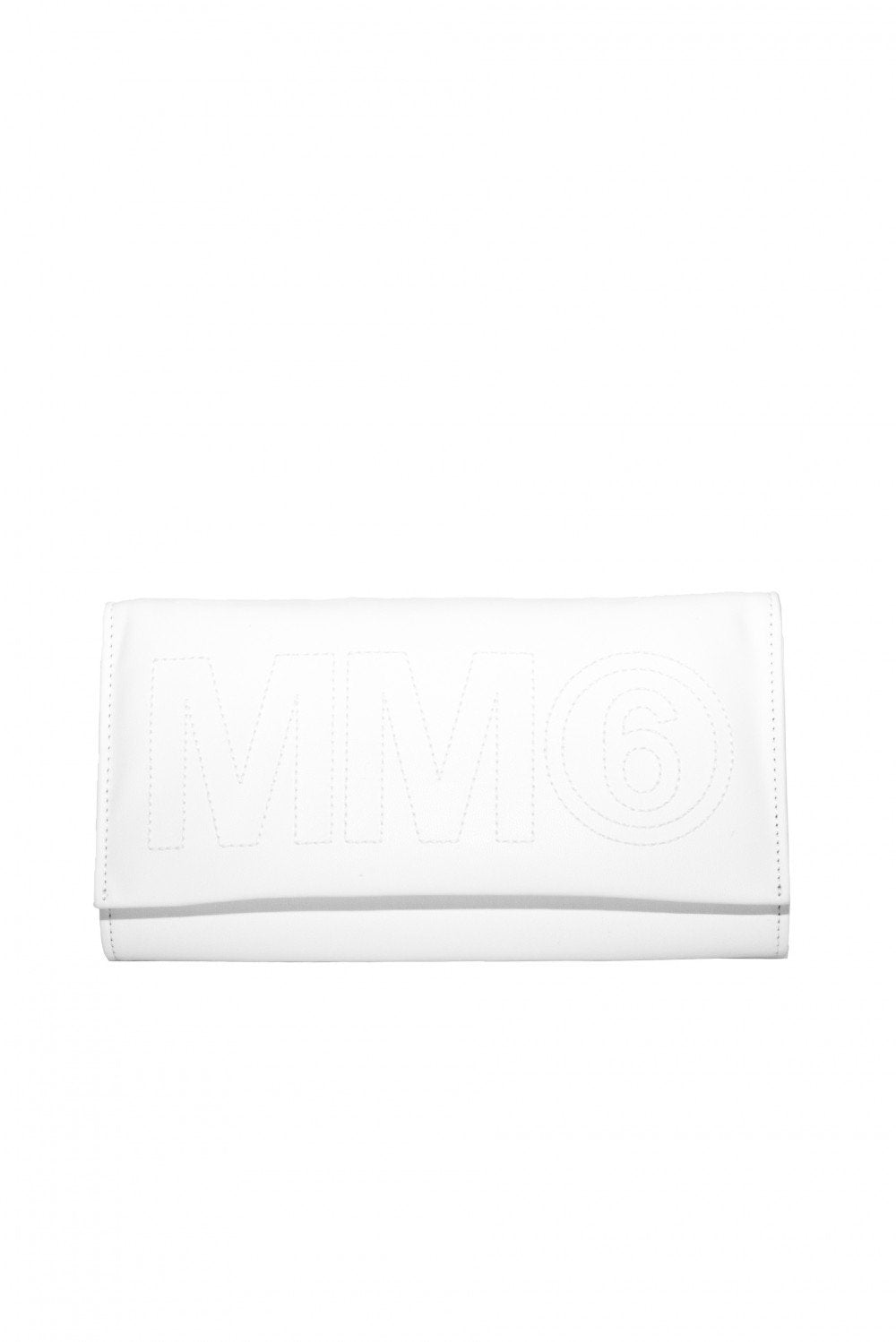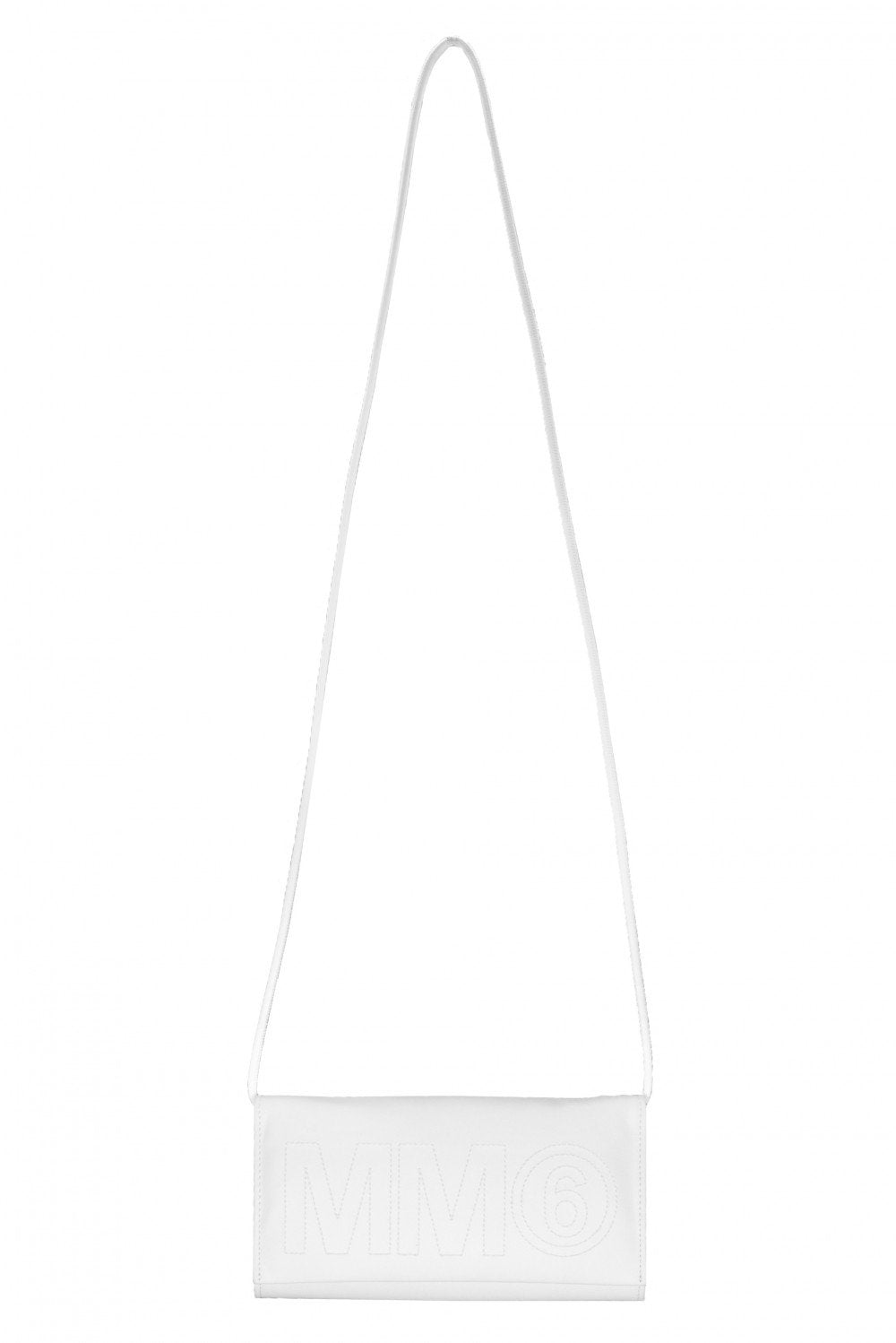 MM6 White Stitched Logo Wallet Crafted from white leather, it features an embroidered logo to the front, a foldover top with snap closure, an internal zipped pocket, multiple interior card slots and shoe lace shoulder strap.
