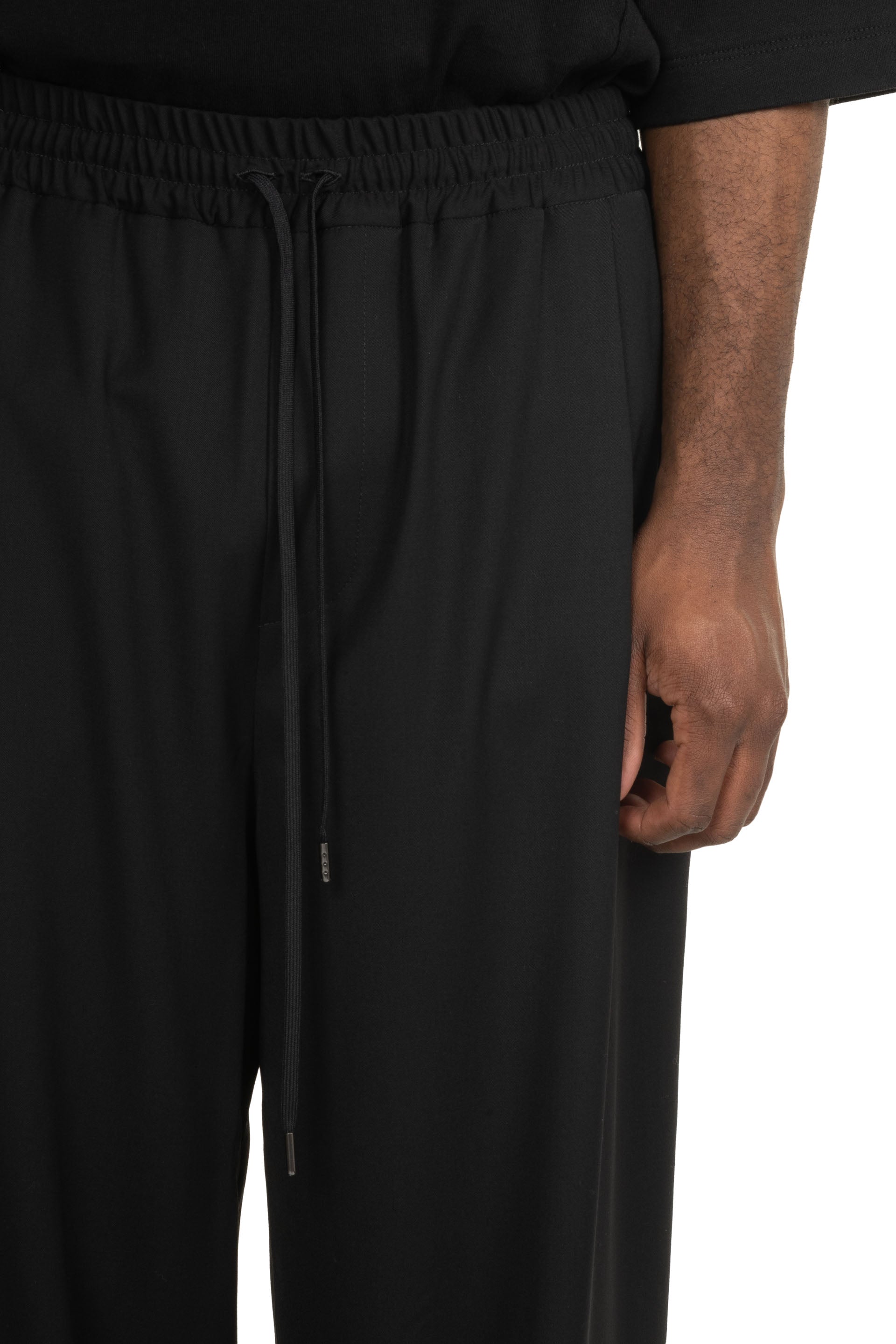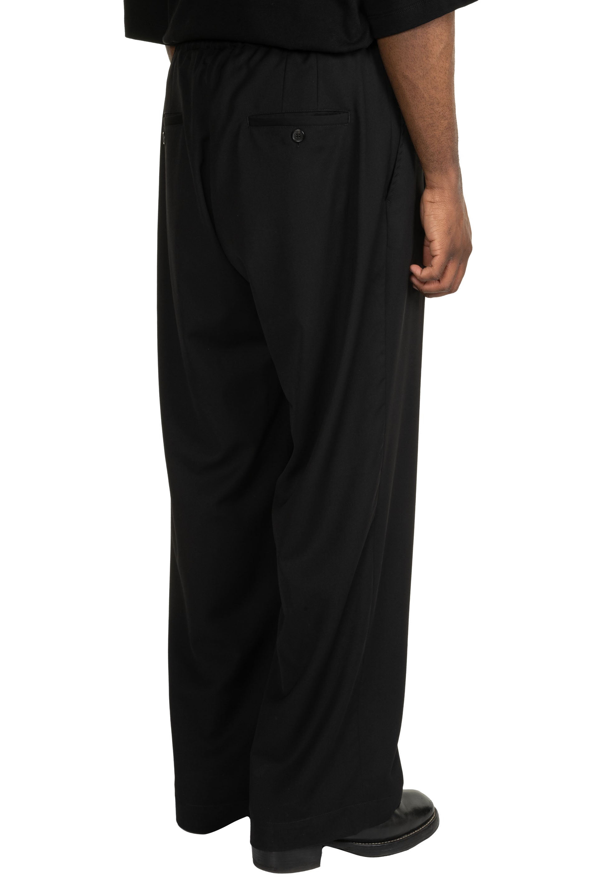 Isabel Benenato Wide-Leg Pants Black. Elastic waist. Drawstrings at waist. Two side pockets. Pleat at front. Wide leg. Two back pockets.