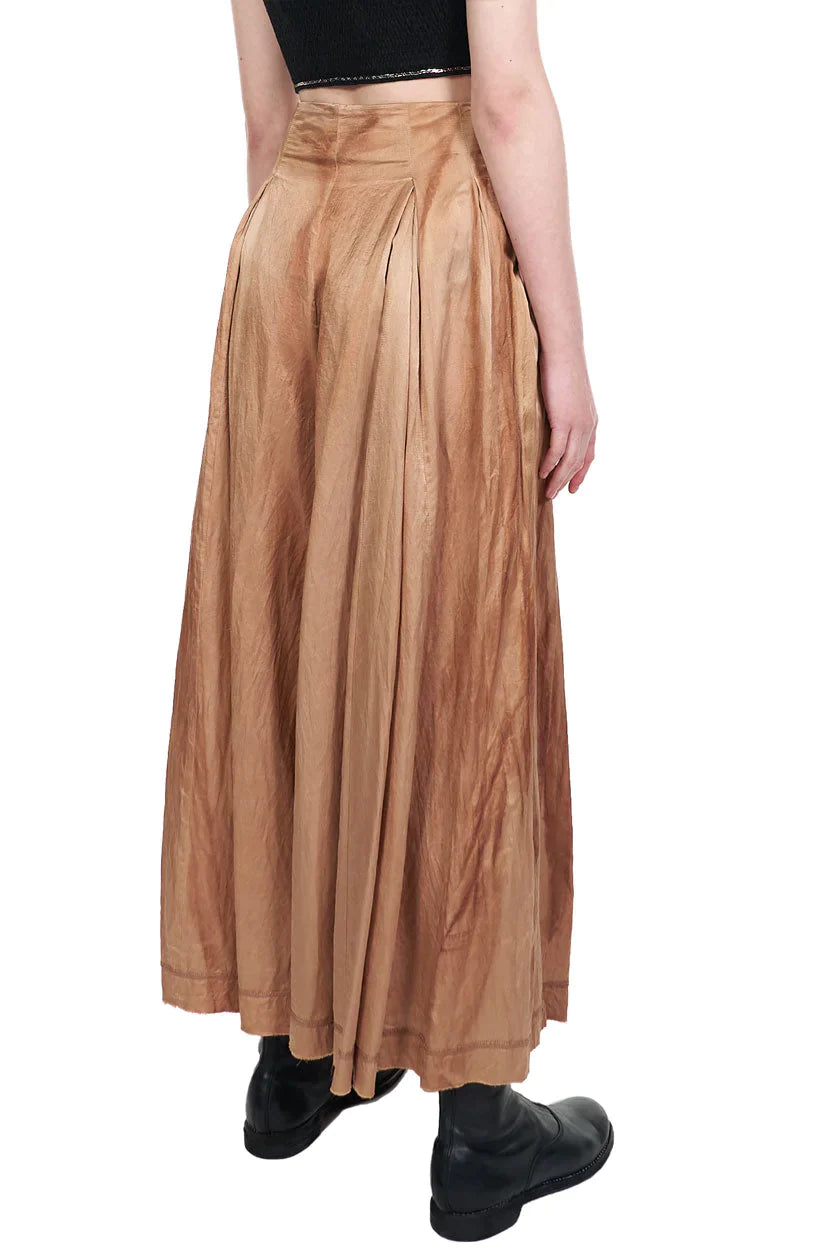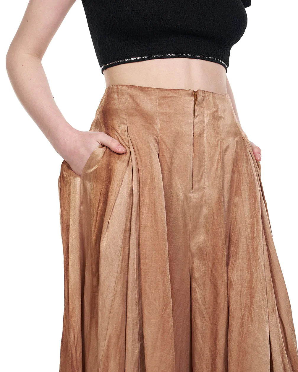 High-rise, pleated trousers. Front zip closure with single button fastening. Multiple shades of tan on fabric. Vertical panel construction. Visible seam detail at hem. Raw edge finish at ankle cuffs.