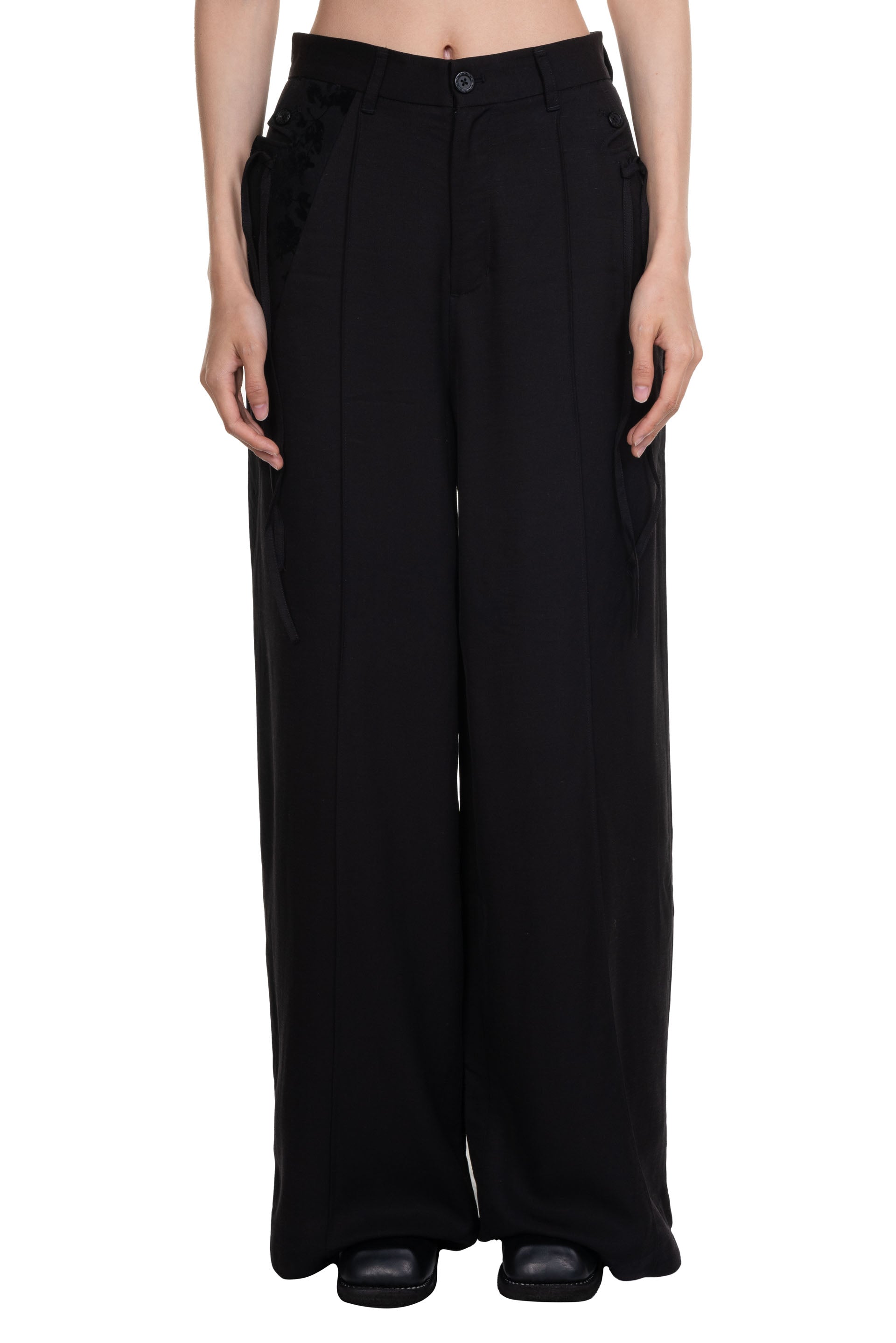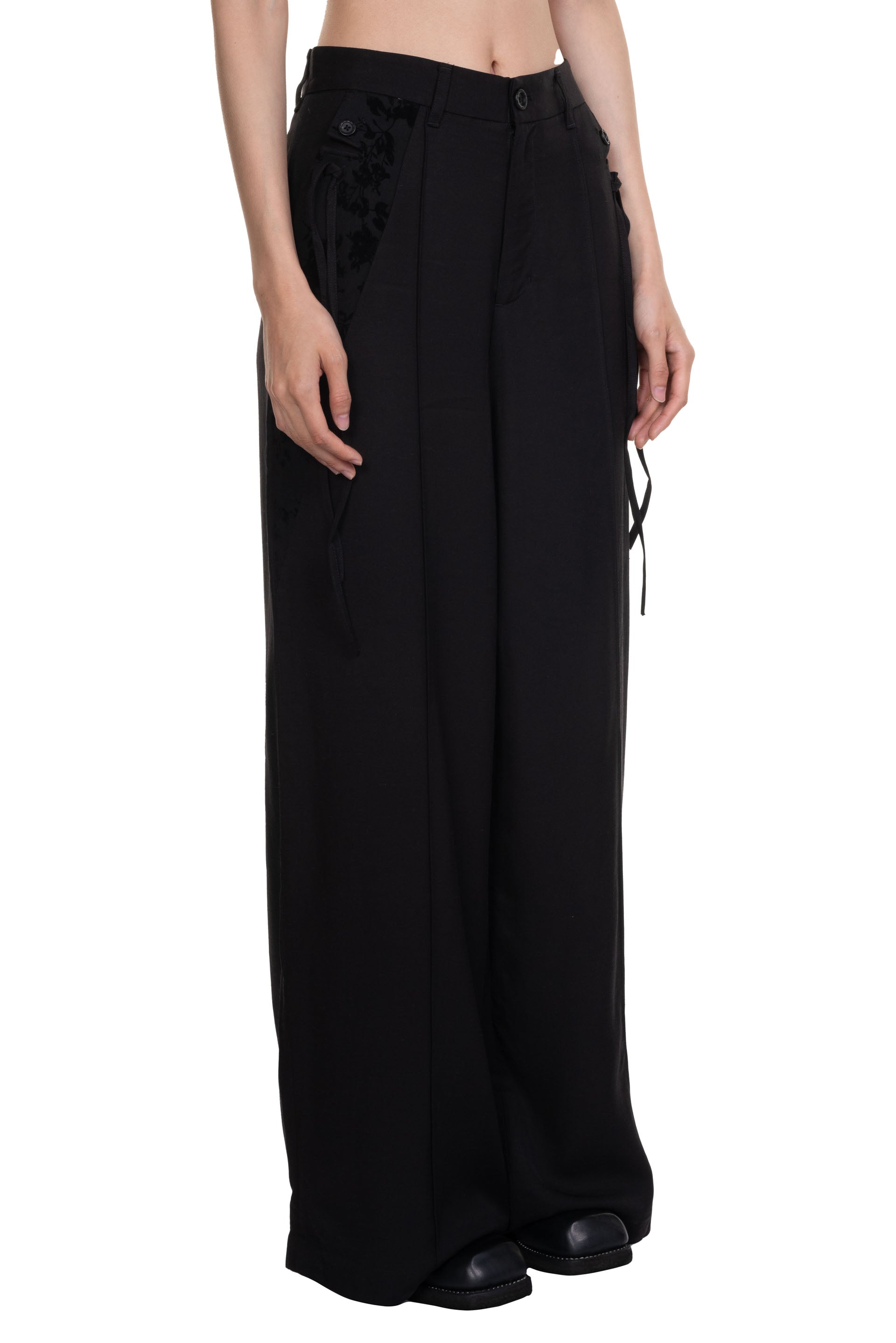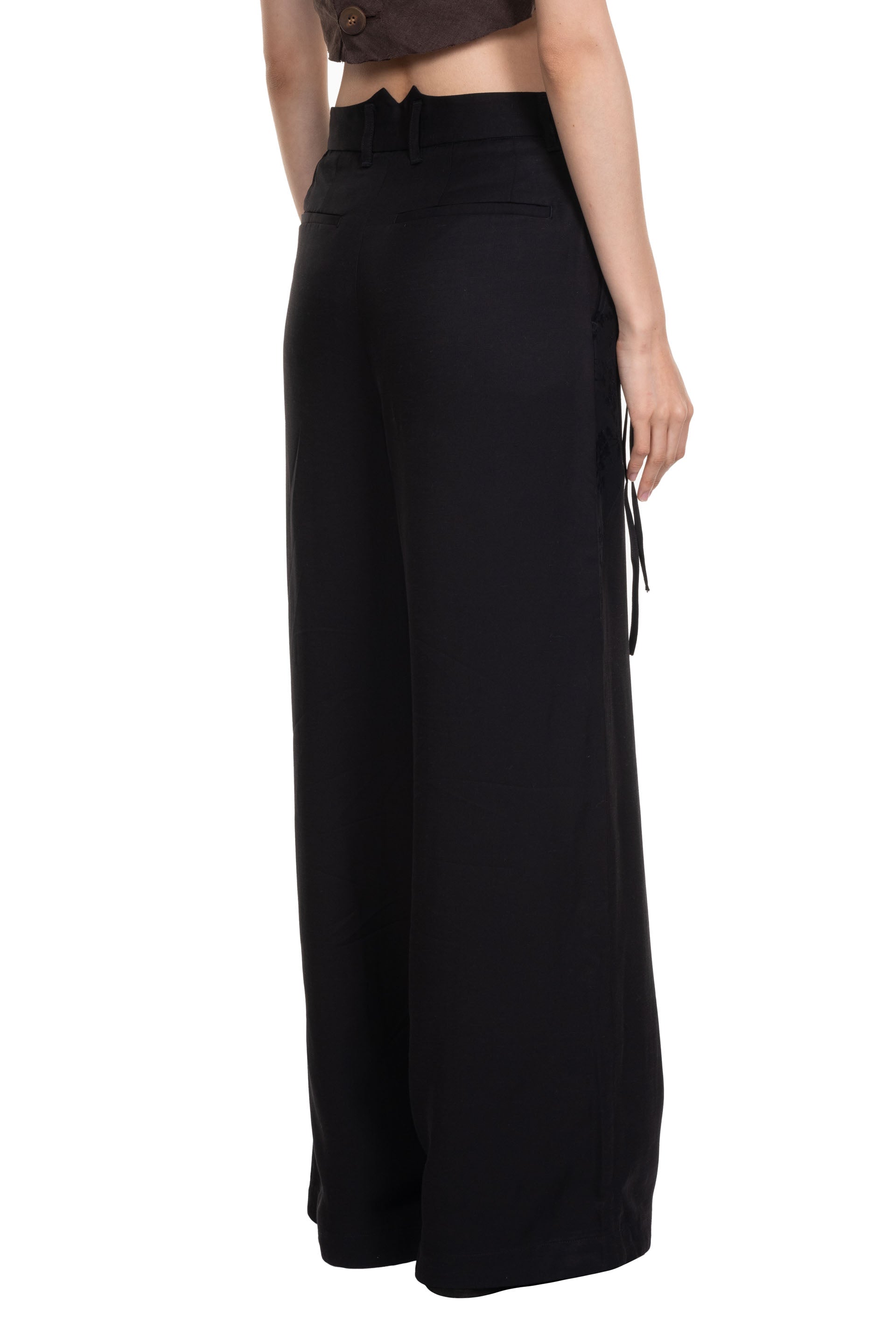 Black Wide Pants from Professor e. Button closure at waist. Two side pockets. Pleated at front. Flower Jacquard detail throughout. Panelled construction. Button details at back and front.