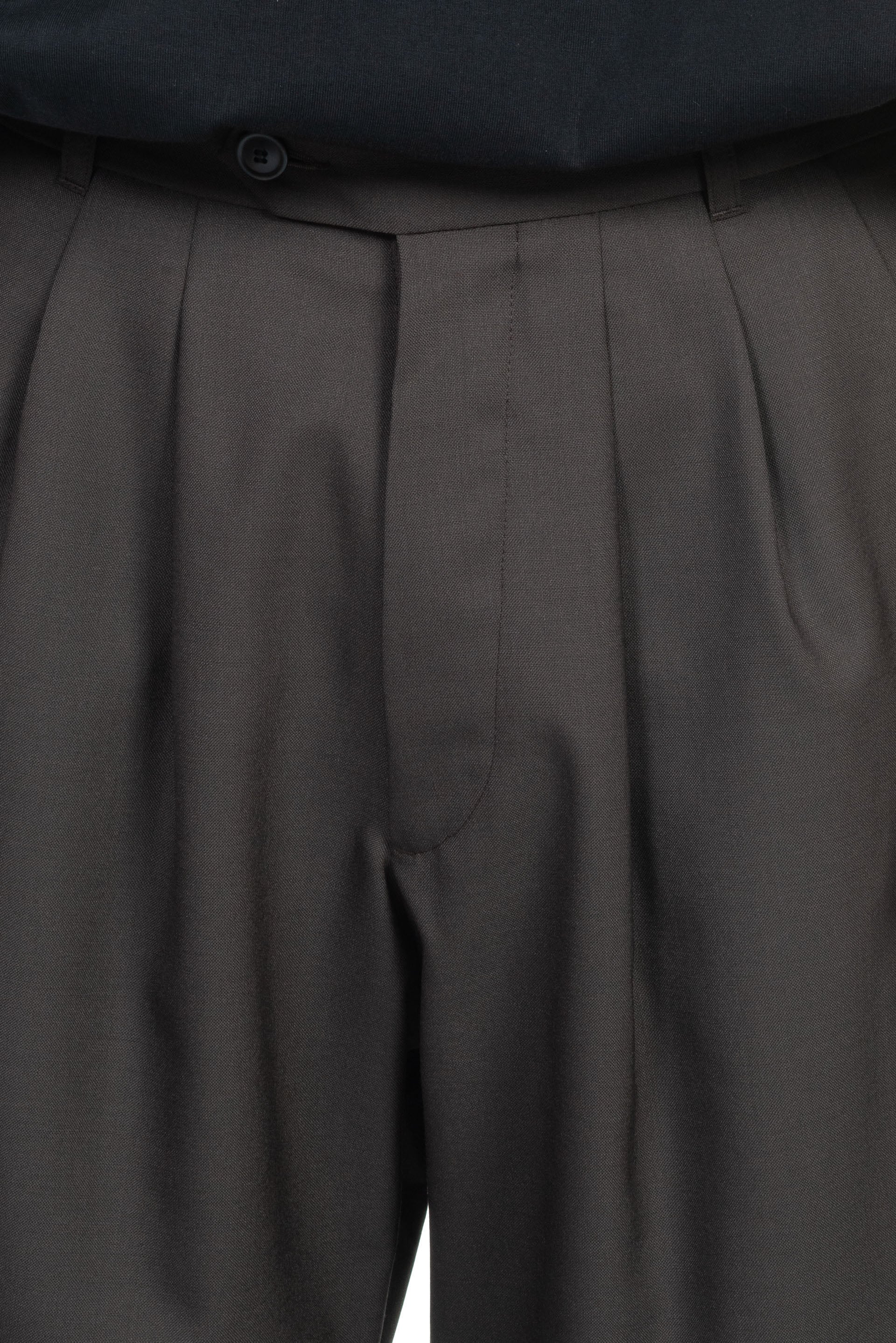 Mid-rise. Pleated front. Horn buttons. Side pockets. Loose fit.