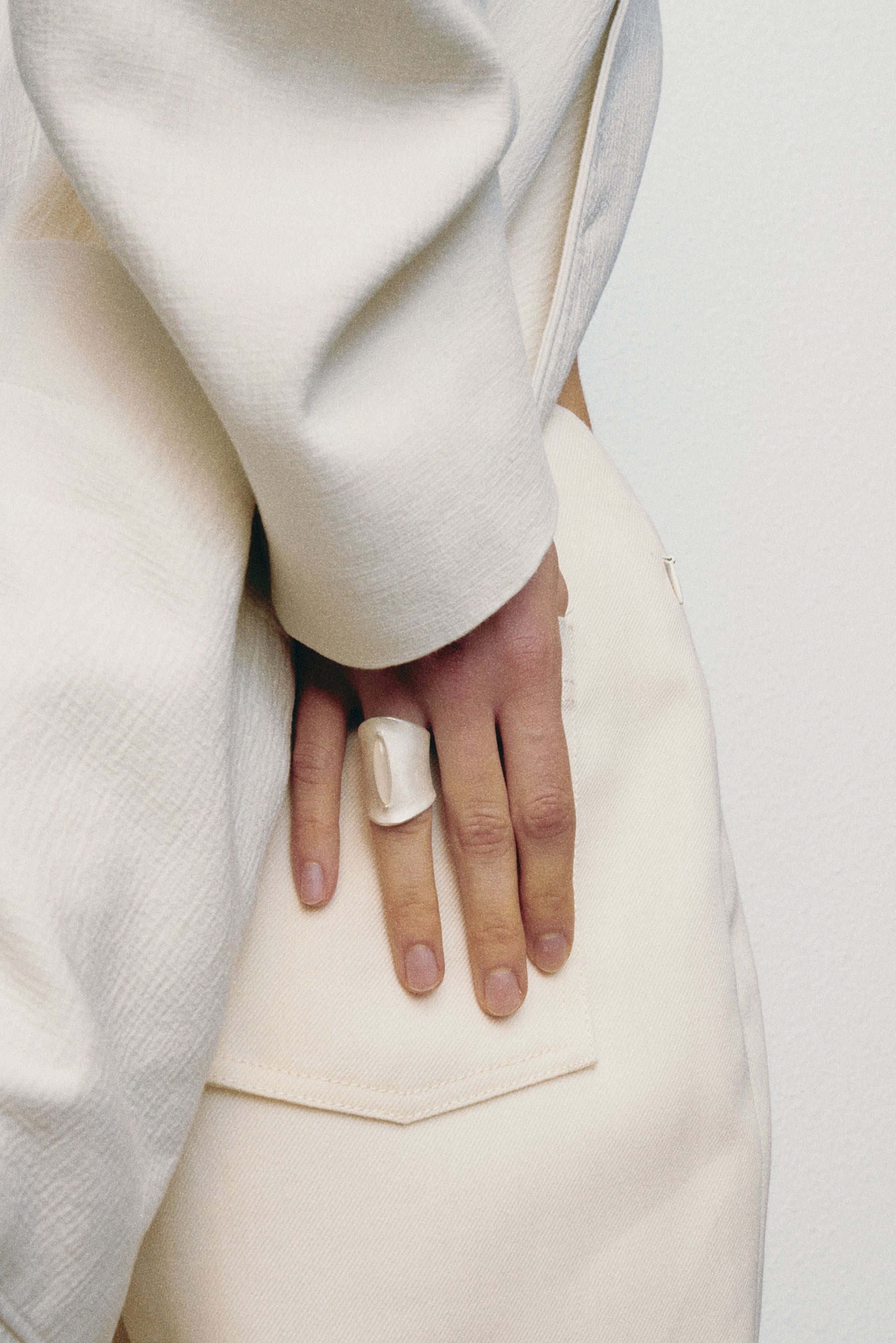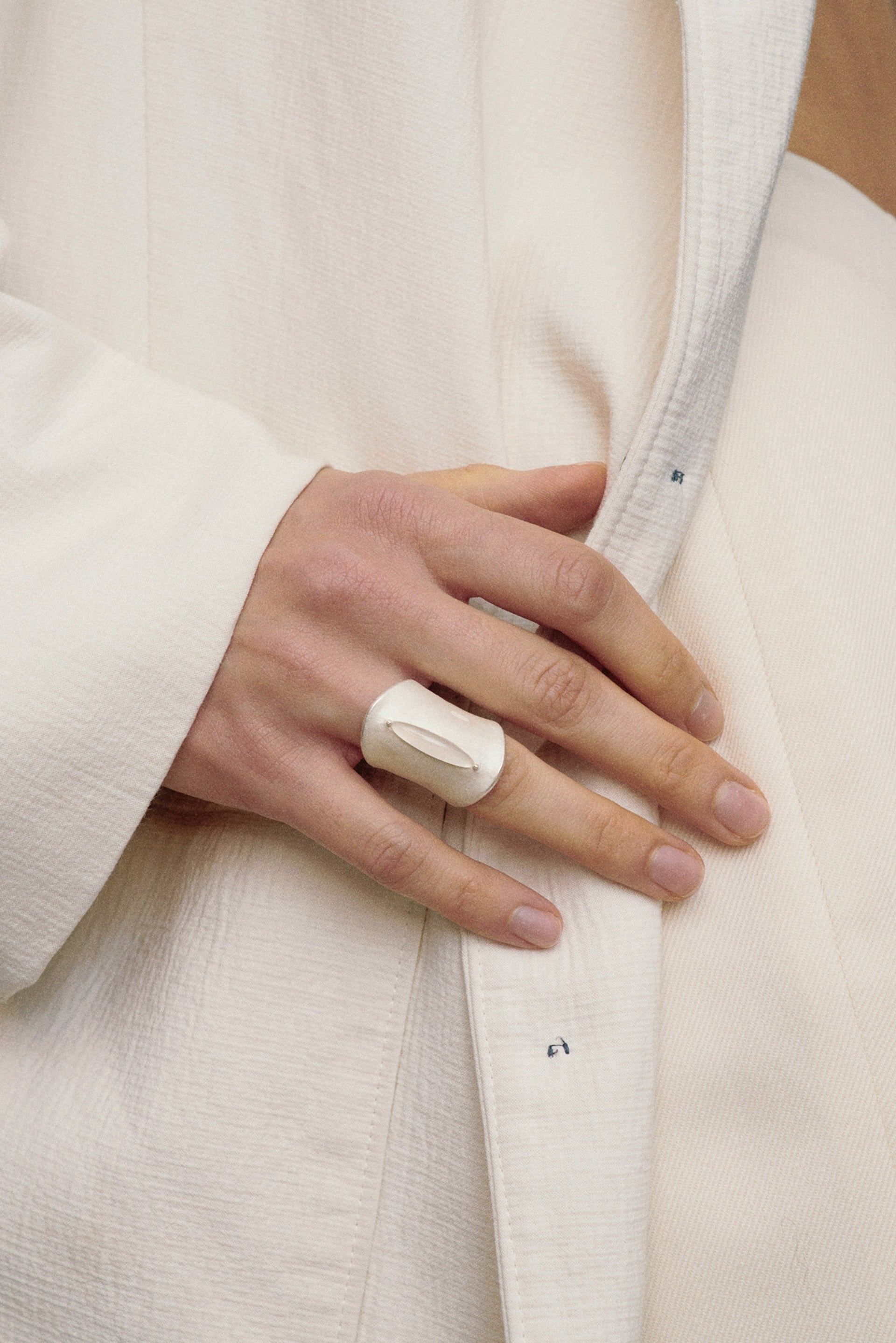 OLIO E ACETO is raw and authentic. It is about the companionship between people, and objects like the matte white surface becoming a blank canvas to be filled by the wearer as seen with the Wide White Whole Ring.
