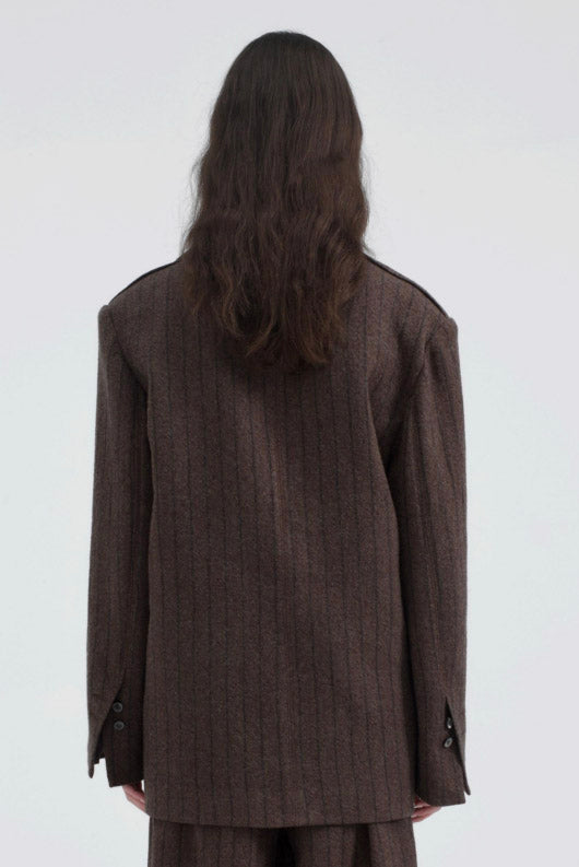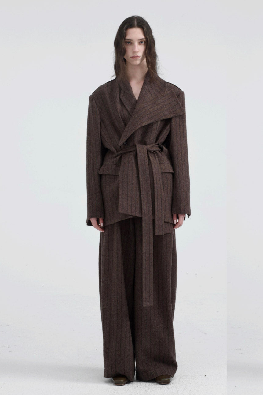 Yehuafan believes in feminine beauty with his own way to explain the smooth curve to compliment women’s body. He specialised in asymmetrical cutting and deconstructed silhouette as seen with the Wool and Silk Jacket Brown.