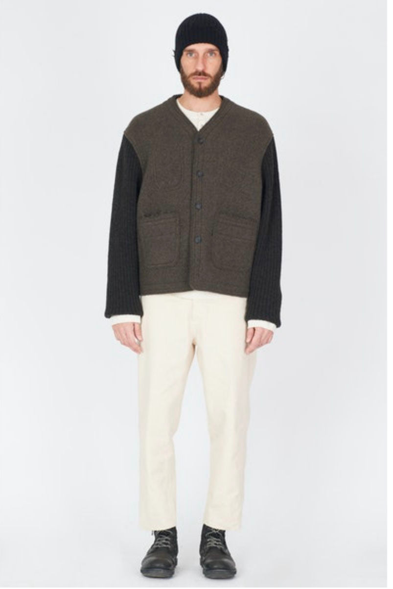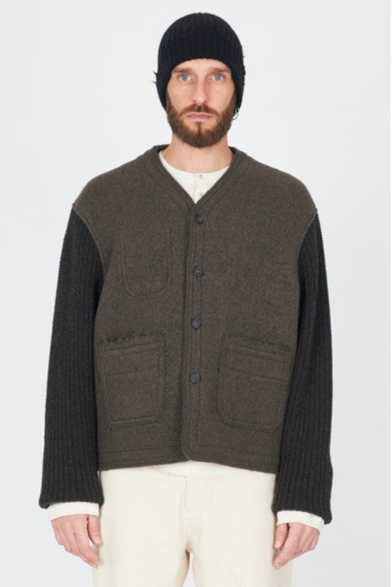 Long sleeves. Button closure at front. Knitted Sleeves. Two side knitted patch pockets. Boxy Cut.
