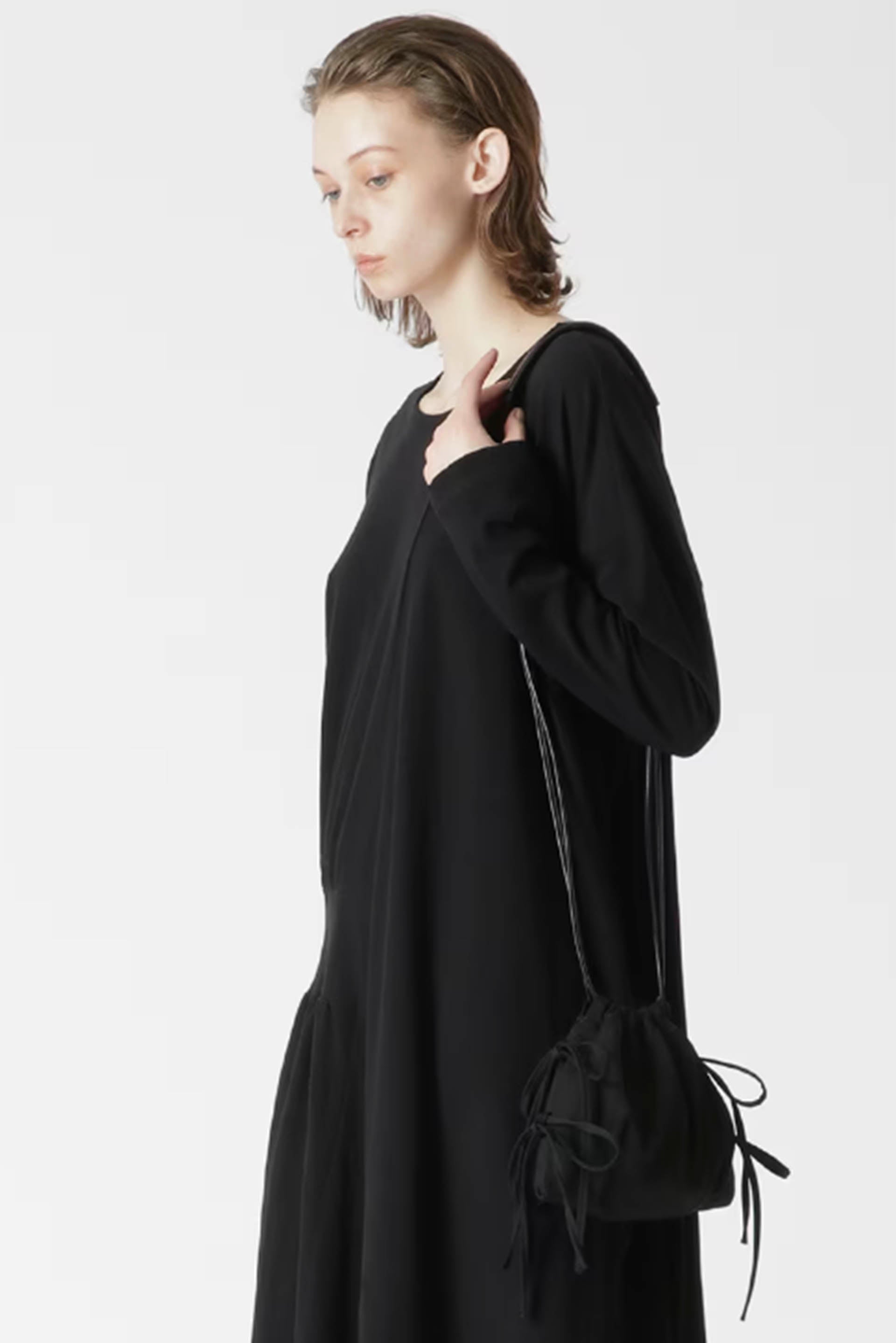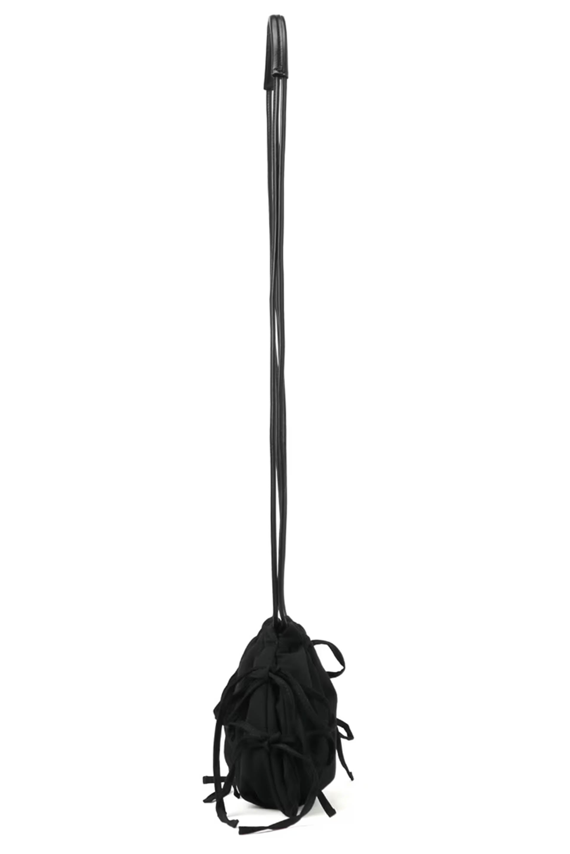 Leather drawstring pochette with ribbon accent. Tight-fitting silhouette. Wool gabardine and leather parts gives a luxurious feel. The compact size can hold a wallet and cell phone.