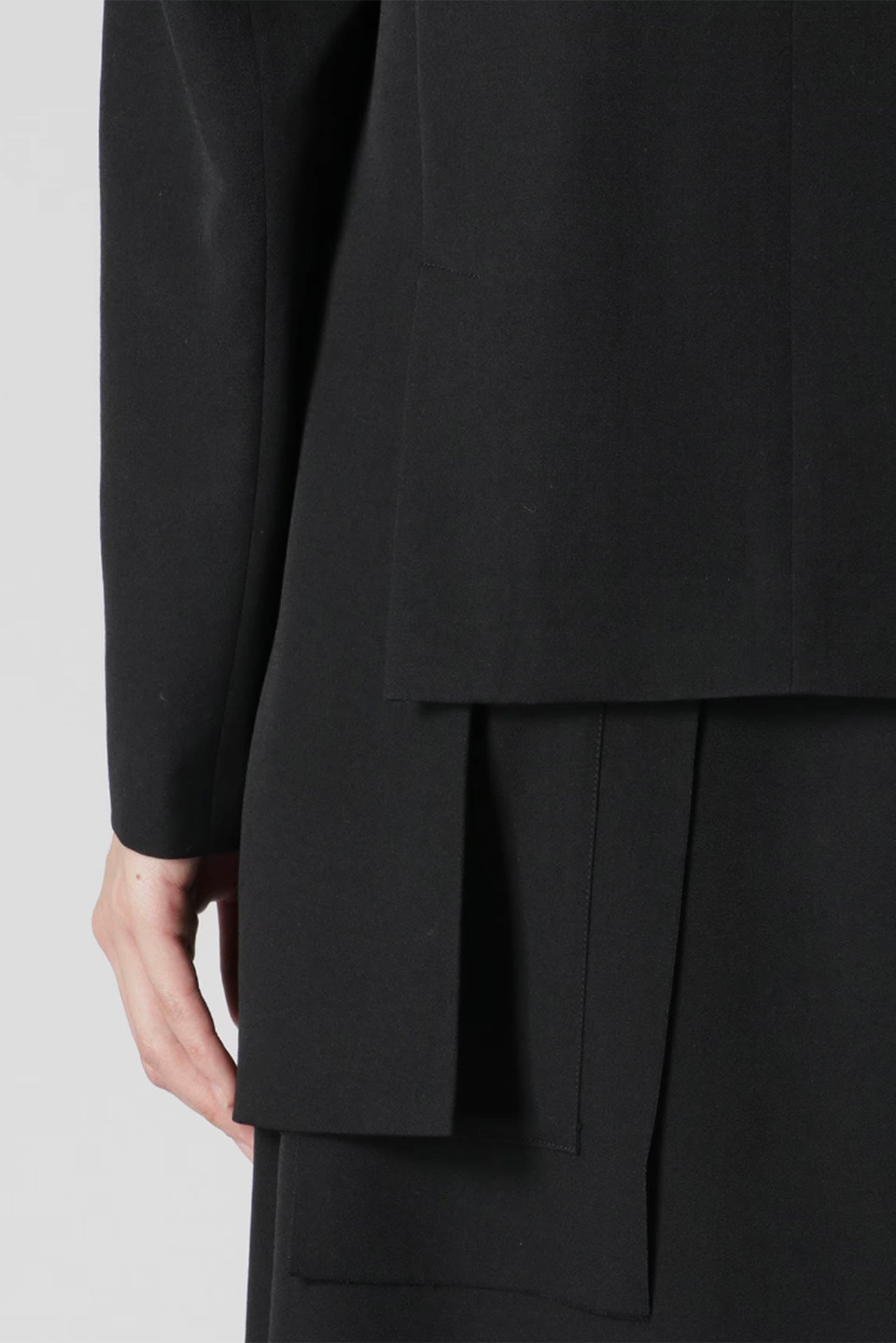 Asymmetric jacket is made of the signature Y’s wool gabardine. Long Sleeves. Two side Pockets. Slightly wrinkled and crinkled fabric during the finishing process to give it the original texture of wool. Bold cut-out on the left front body.