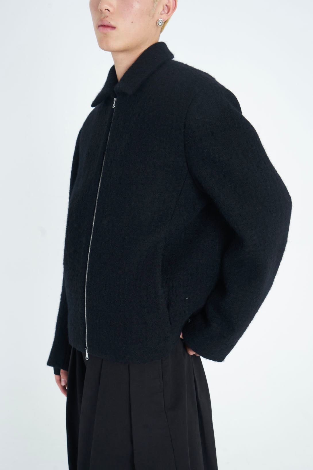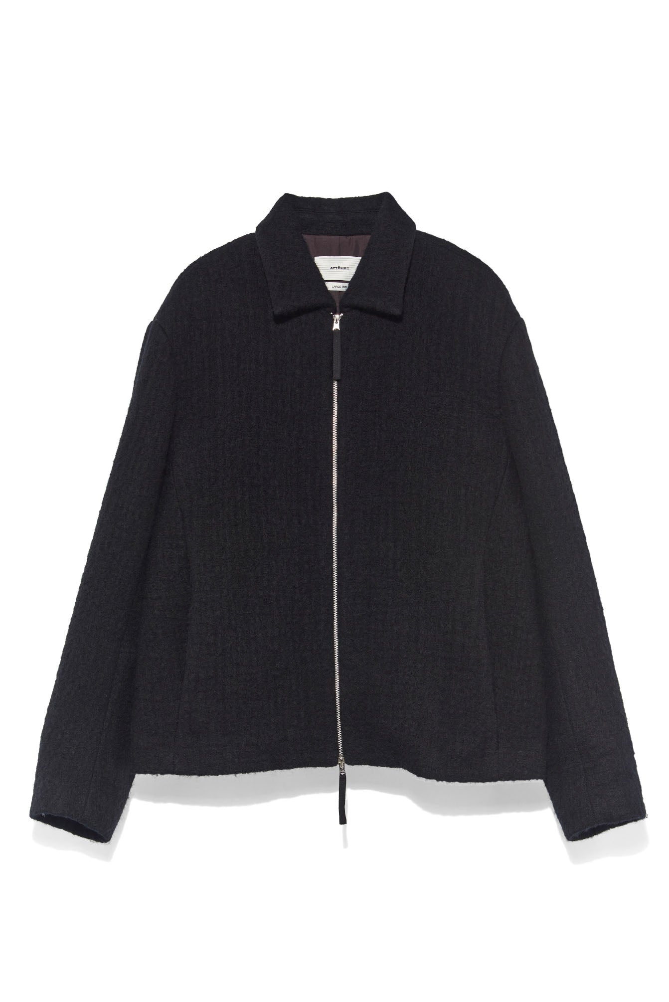 ATTEMPT reconstructs different styles and elements to create a new aesthetic system. By taking a more experimental approach to creation and production, which involves an understanding of the past and the current form of society, Attempt is creating an aesthetic form that is anchored in the present but different from it. It must ultimately be a product that cannot be defined as seen with the Wool Jacket Black.