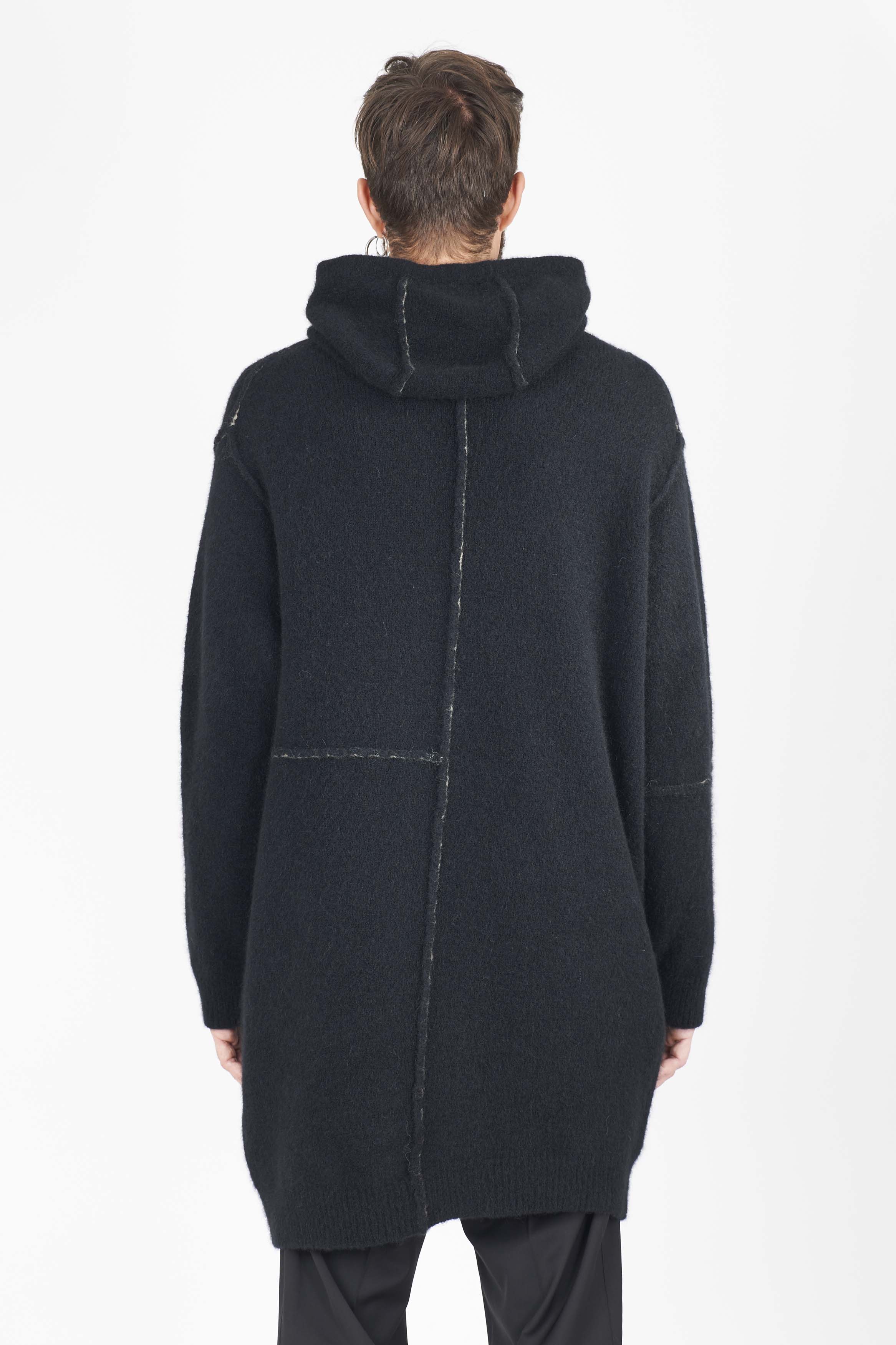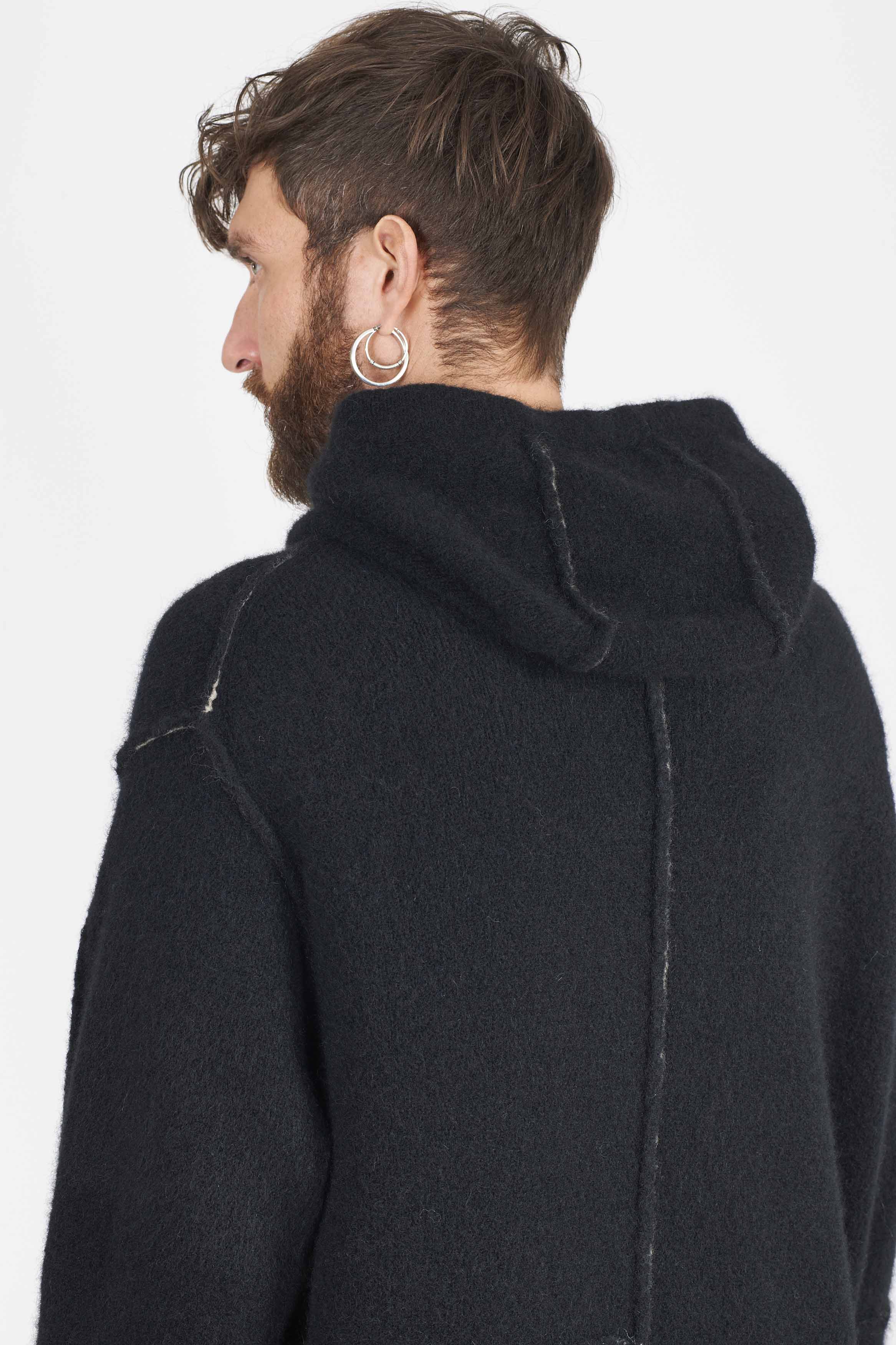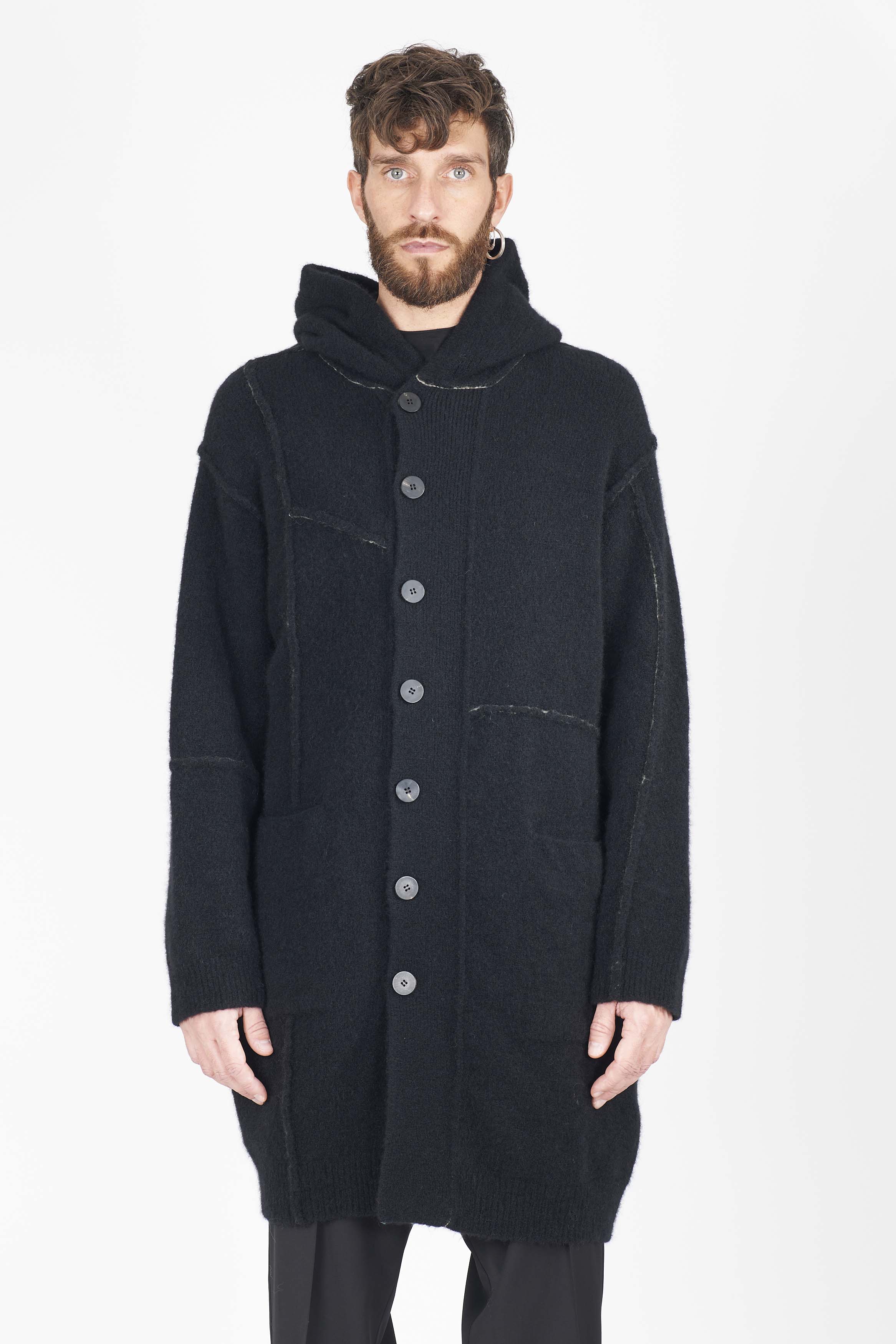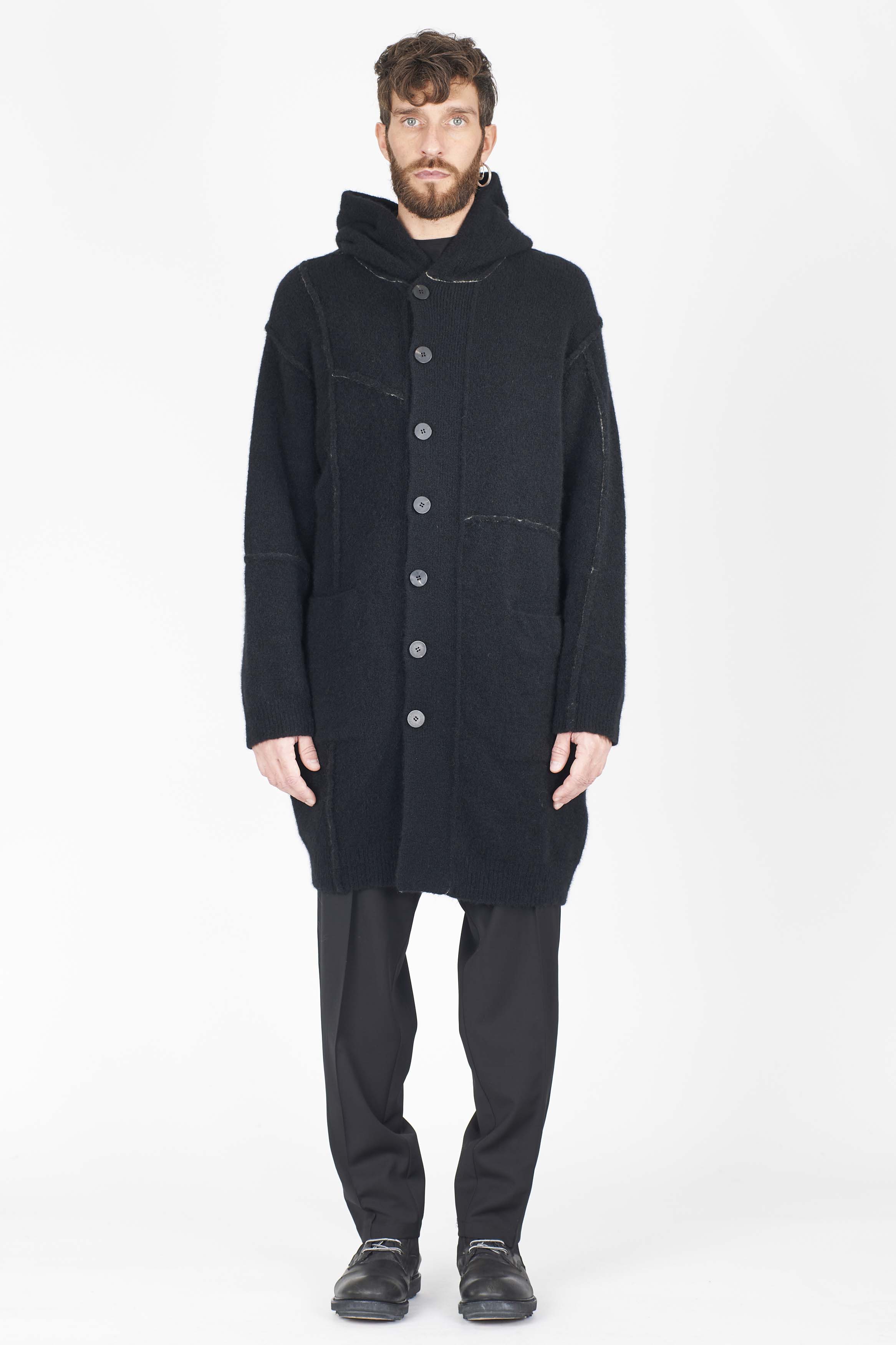 Isabel Benenato hooded coat. Exposed button fastening at front Collar. Dropped shoulders. Long sleeves. Two patch pockets at front. Contrasting panels. Loose-fit.Colour: Black. Composition: Yak