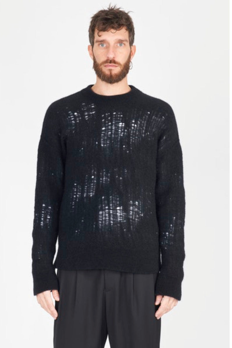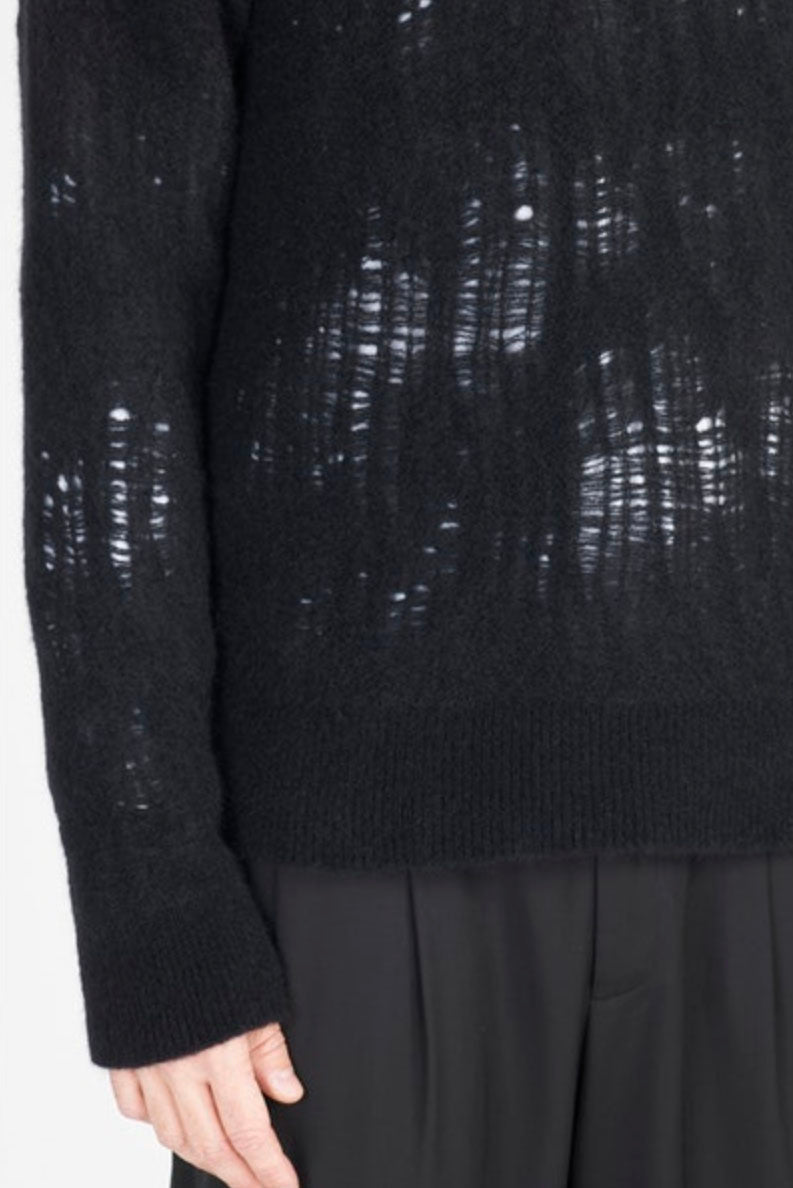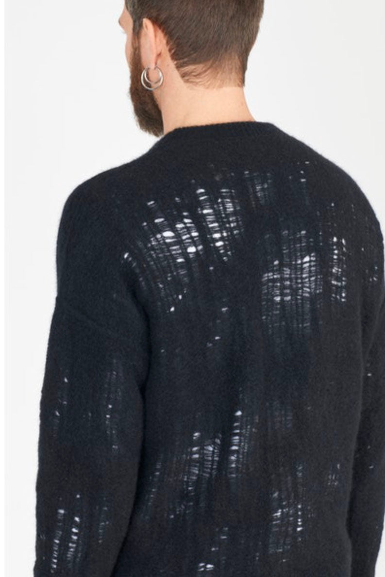 Round neck. Long sleeves. Distressed detailing throughout. Textural effect throughout.