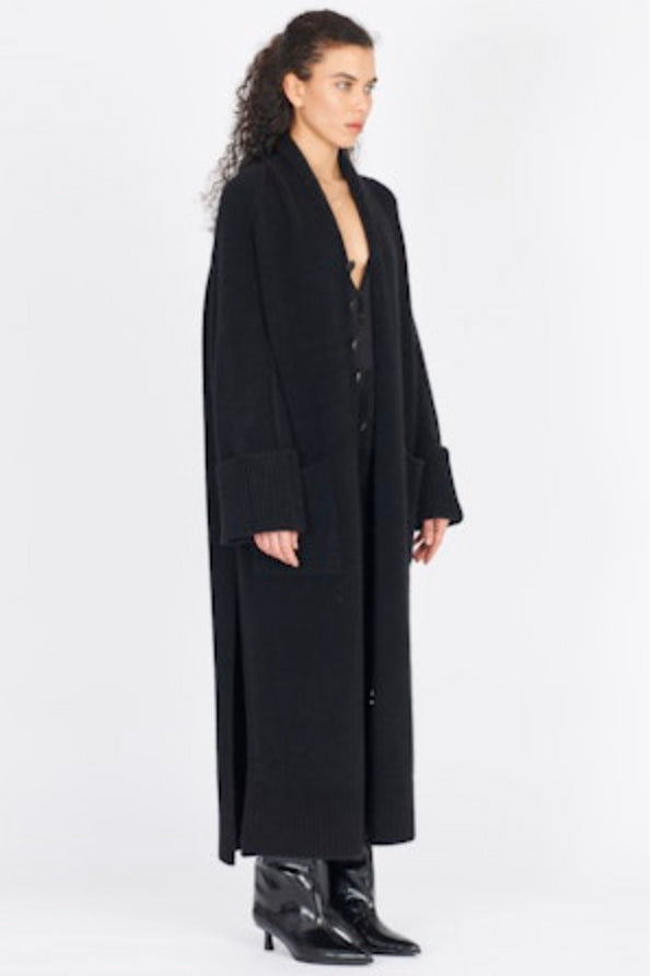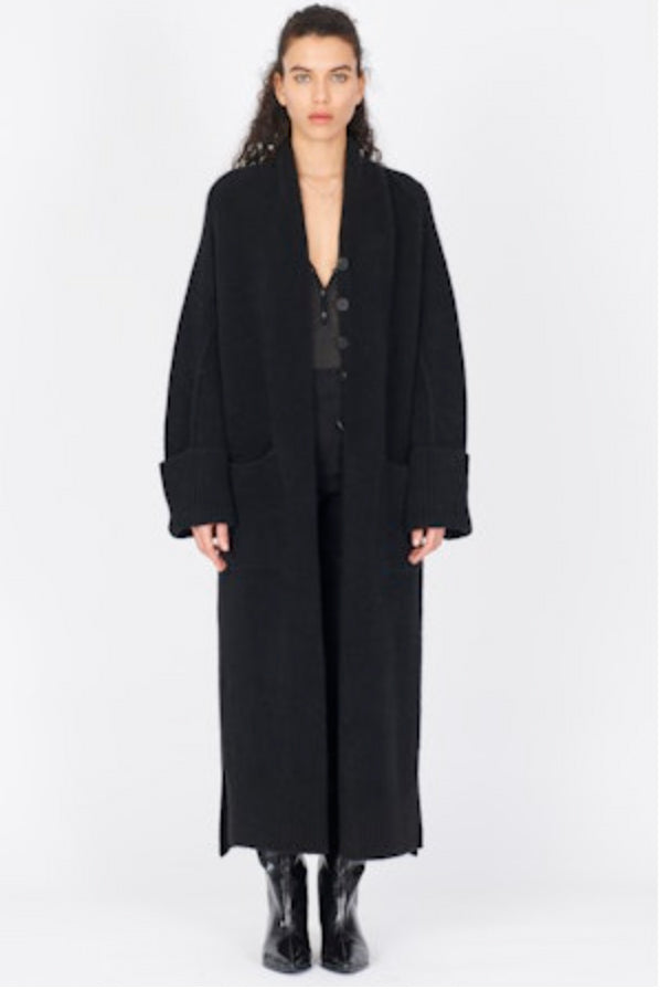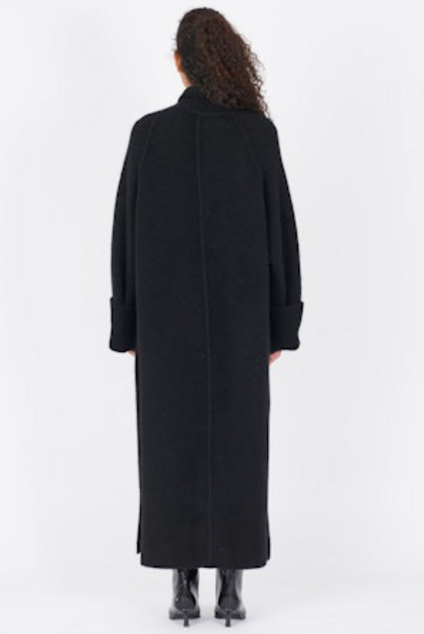 Isabel Benenato is committed to sustainability and makes every effort to minimise its environmental footprint. All of the collection are manufactured in Italy with the intention to save and support her local community. Her design is based on an imperfect perfection that encompasses the human being itself as seen with Yak Long Knit Coat Black.