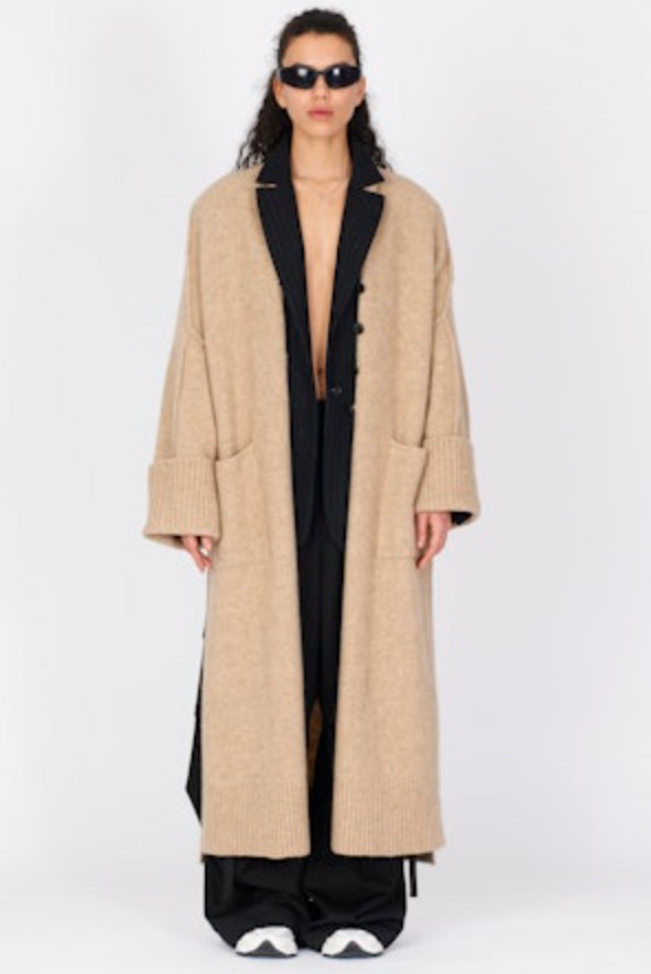 Isabel Benenato is committed to sustainability and makes every effort to minimise its environmental footprint. All of the collection are manufactured in Italy with the intention to save and support her local community. Her design is based on an imperfect perfection that encompasses the human being itself as seen with Yak Long Knit Coat Natural.