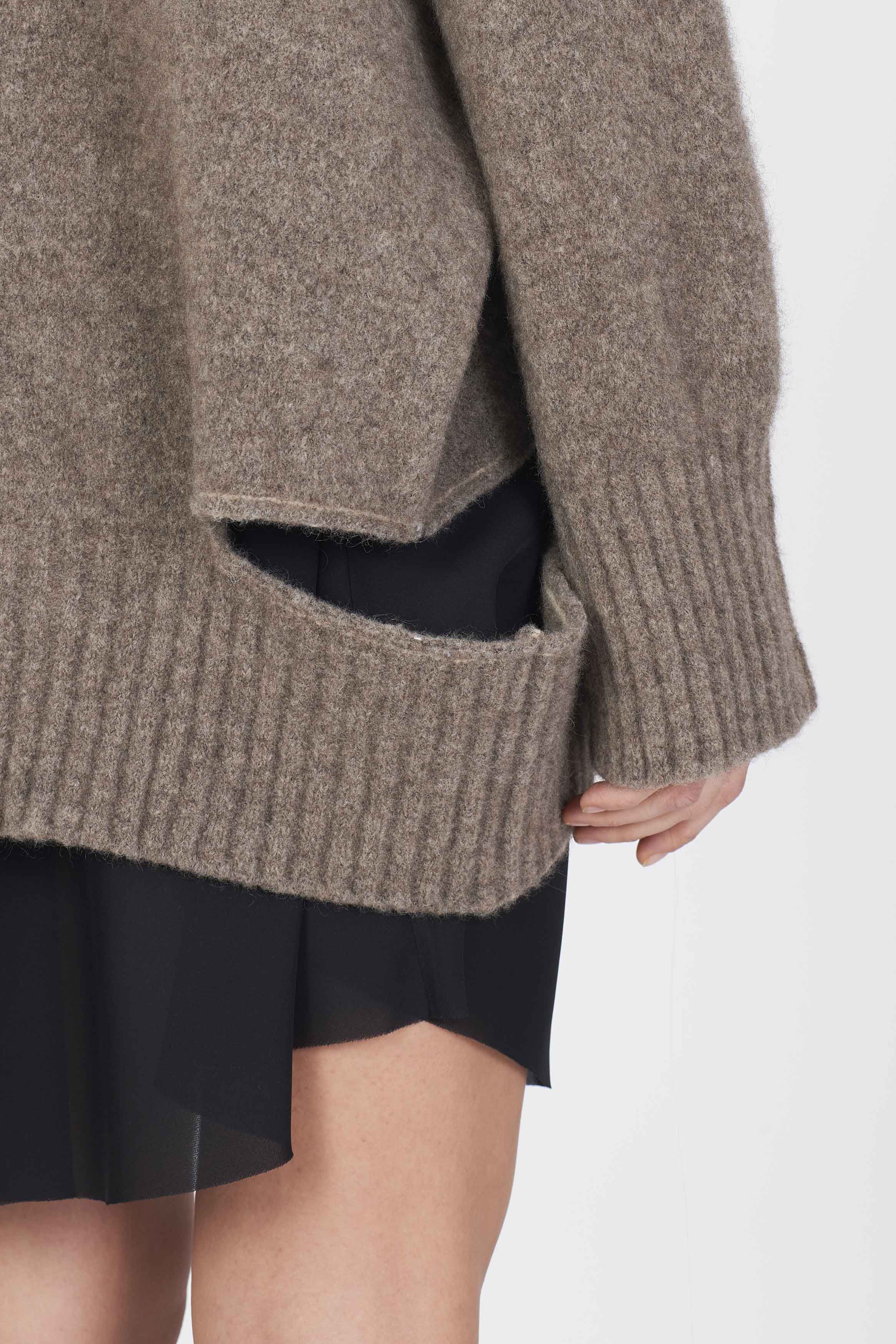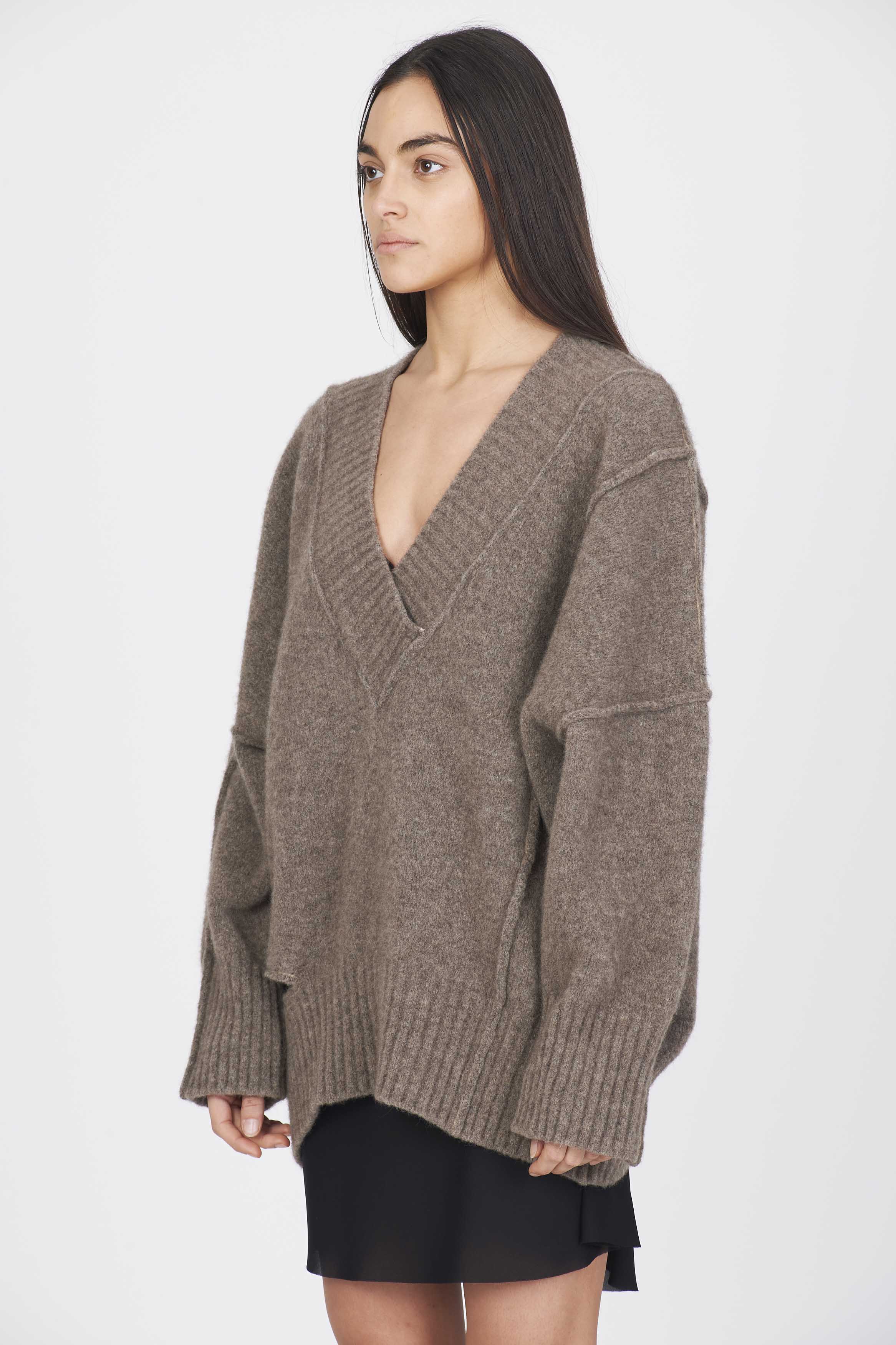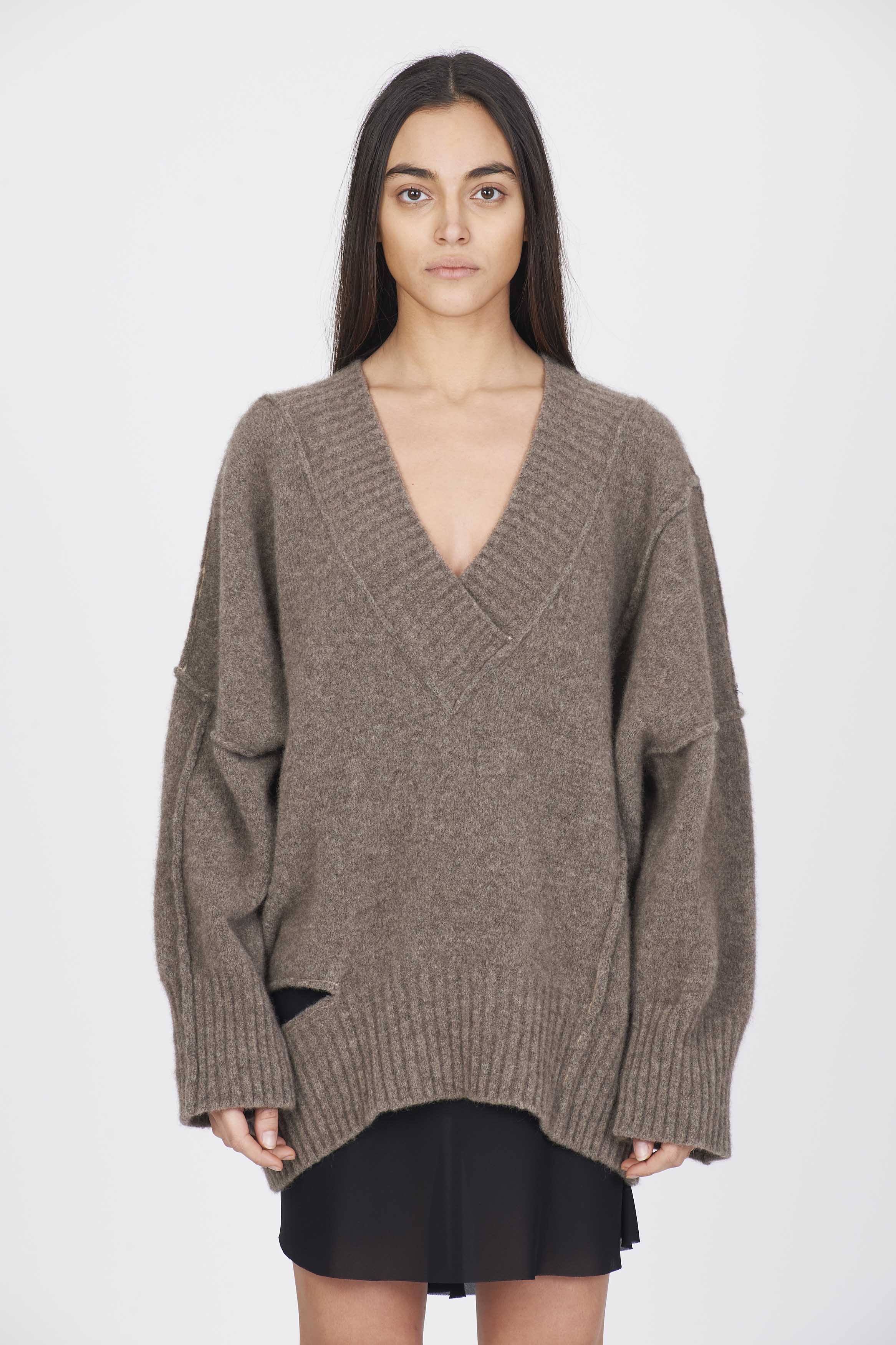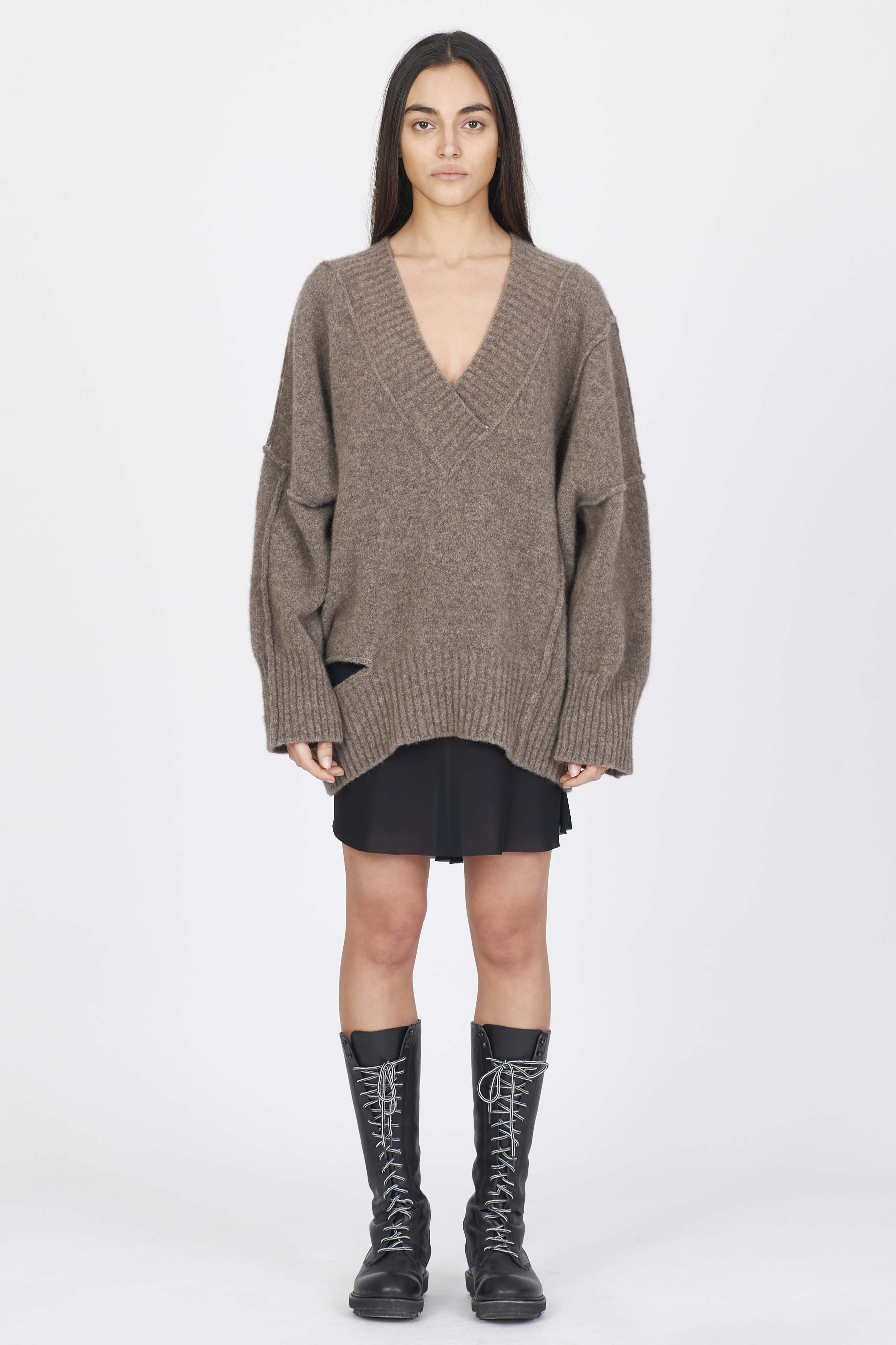 Oversize yak V neck knit. External stitches. Slit details on the edges. Oversize fit.