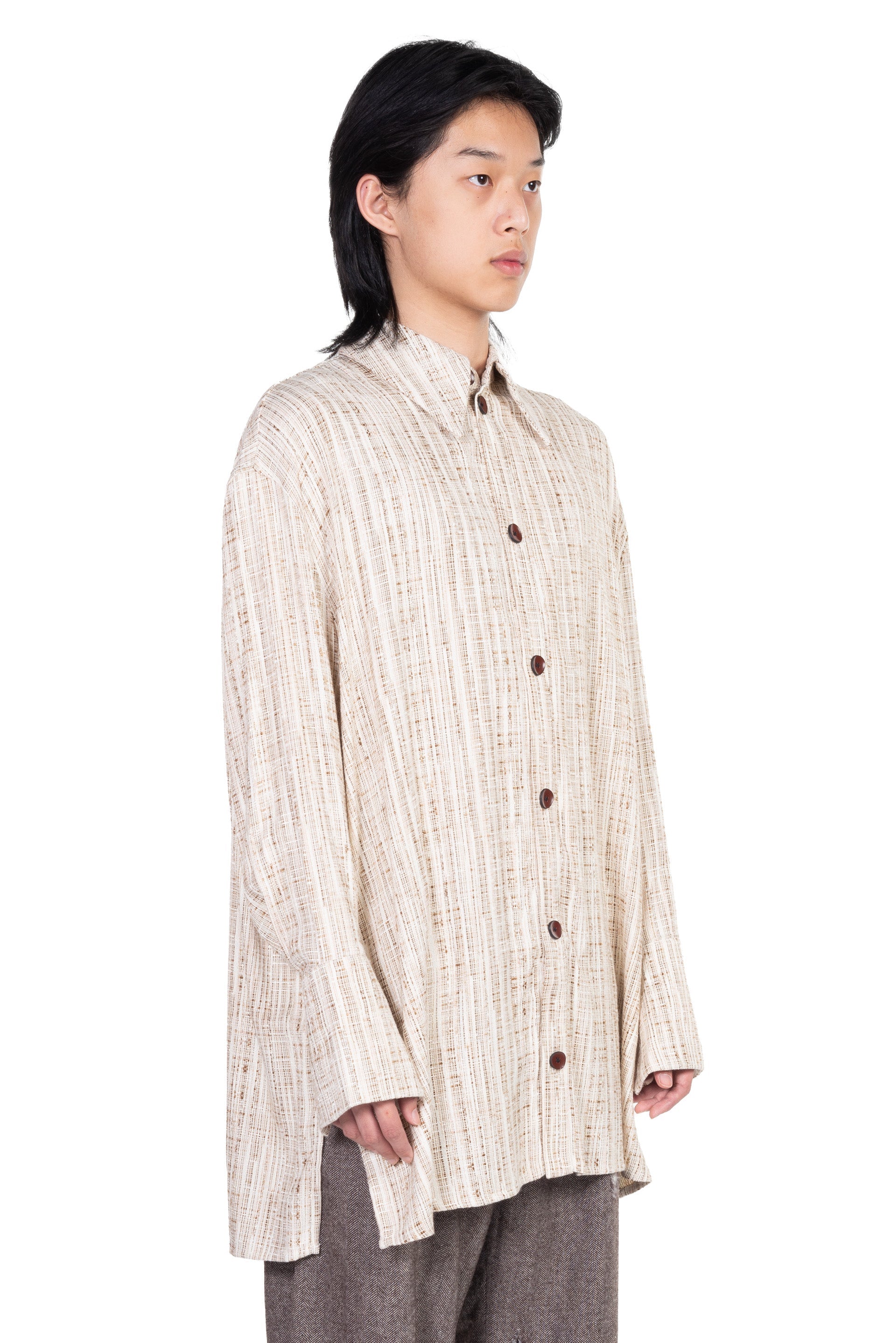 Peng Tai creates modern silhouette with traditional chinese philosophy. Inspired by how Chinese herbal medicine regulates the body from the inside out, Peng Tai aims to research and develop a way to boil Chinese herbal medicine with fabrics, to create clothes that feel like a second skin as seen with the Yard Dyed Oversized Shirt.