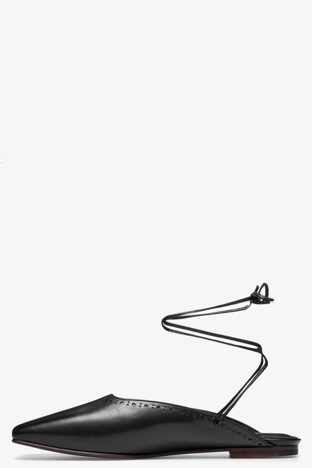 aarahee flat slides shoes. Flat mule silhouette. Brogue detailing. Detachable ankle straps.