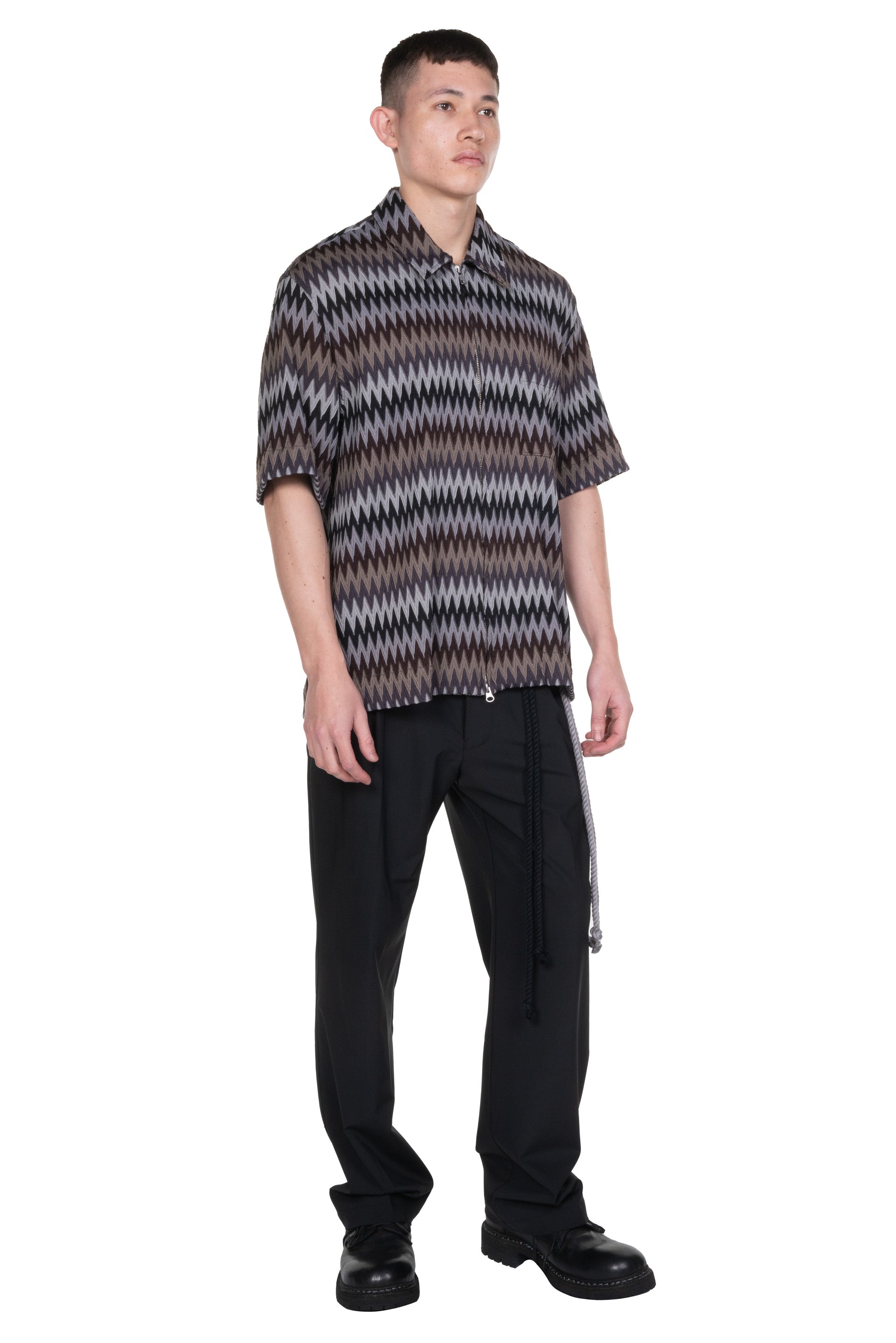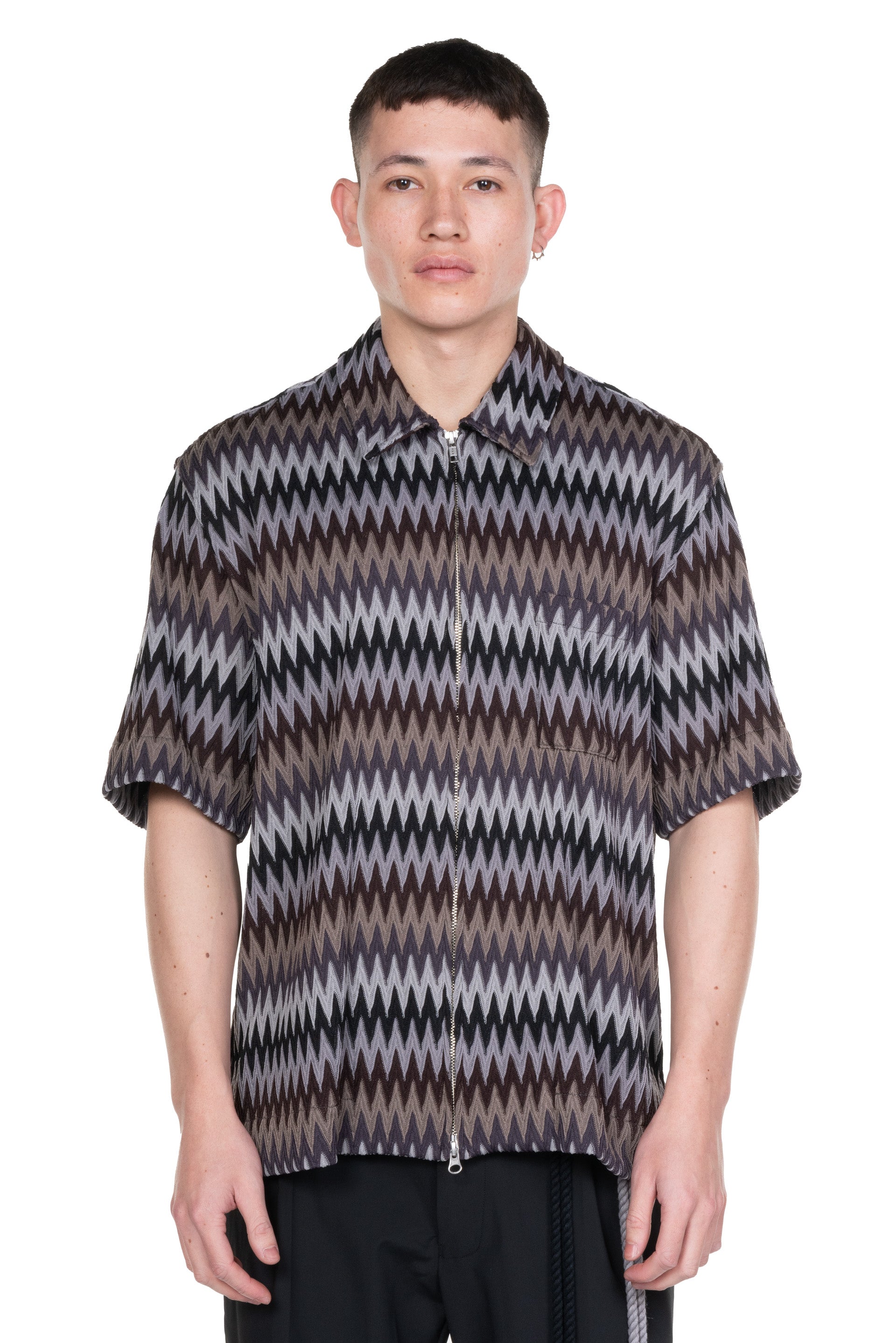 Song for the Mute Oversized fit short sleeve double closure zip up shirt in a zig zag knit. Featuring a two-way zip closure, chest patch pocket and vented side seams.