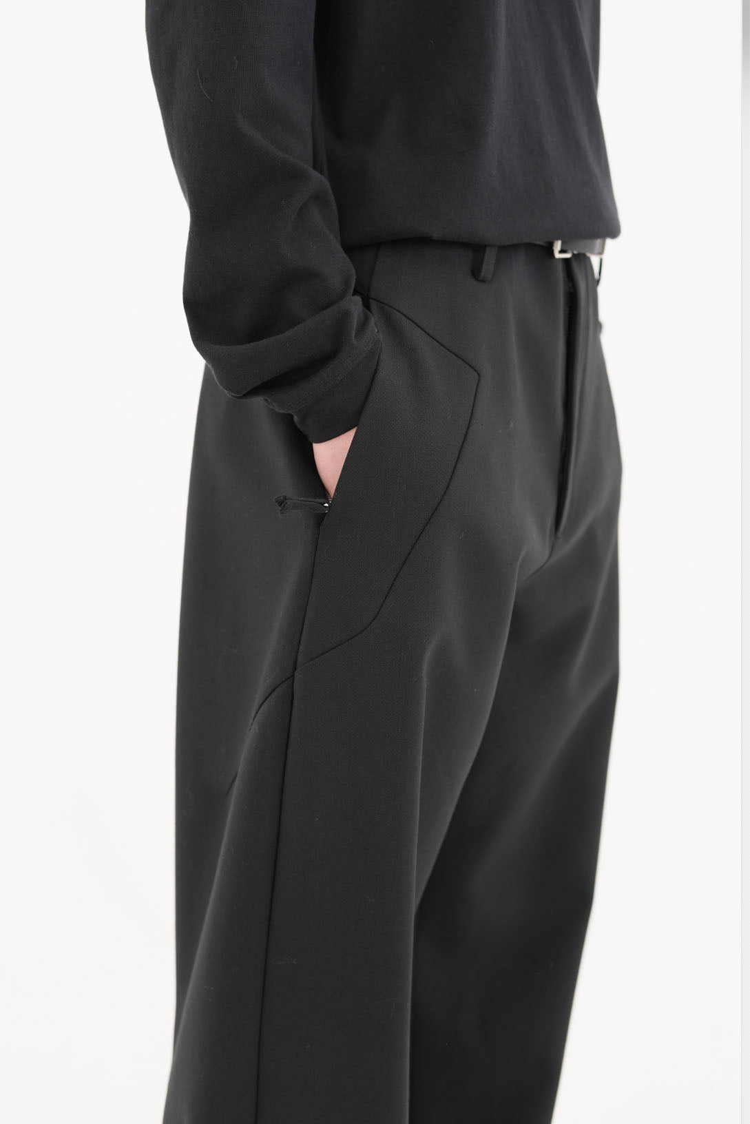 Attempt black trousers with zip pockets. Button and hook closure at waist. Two side pockets with zip closure. One back pockets. Straight long fit. Soft textural wool fabric.
