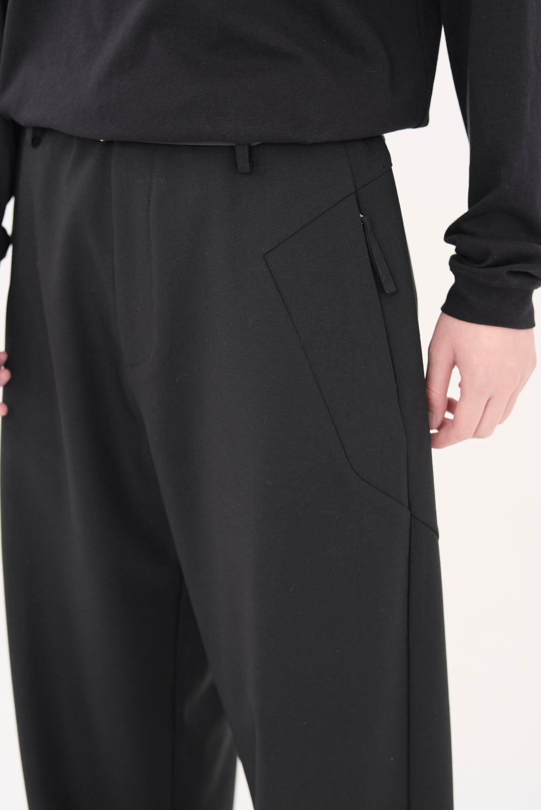 ATTEMPT reconstructs different styles and elements to create a new aesthetic system. By taking a more experimental approach to creation and production, which involves an understanding of the past and the current form of society, Attempt is creating an aesthetic form that is anchored in the present but different from it. It must ultimately be a product that cannot be defined as seen with the Zip Pocket Trousers Black.