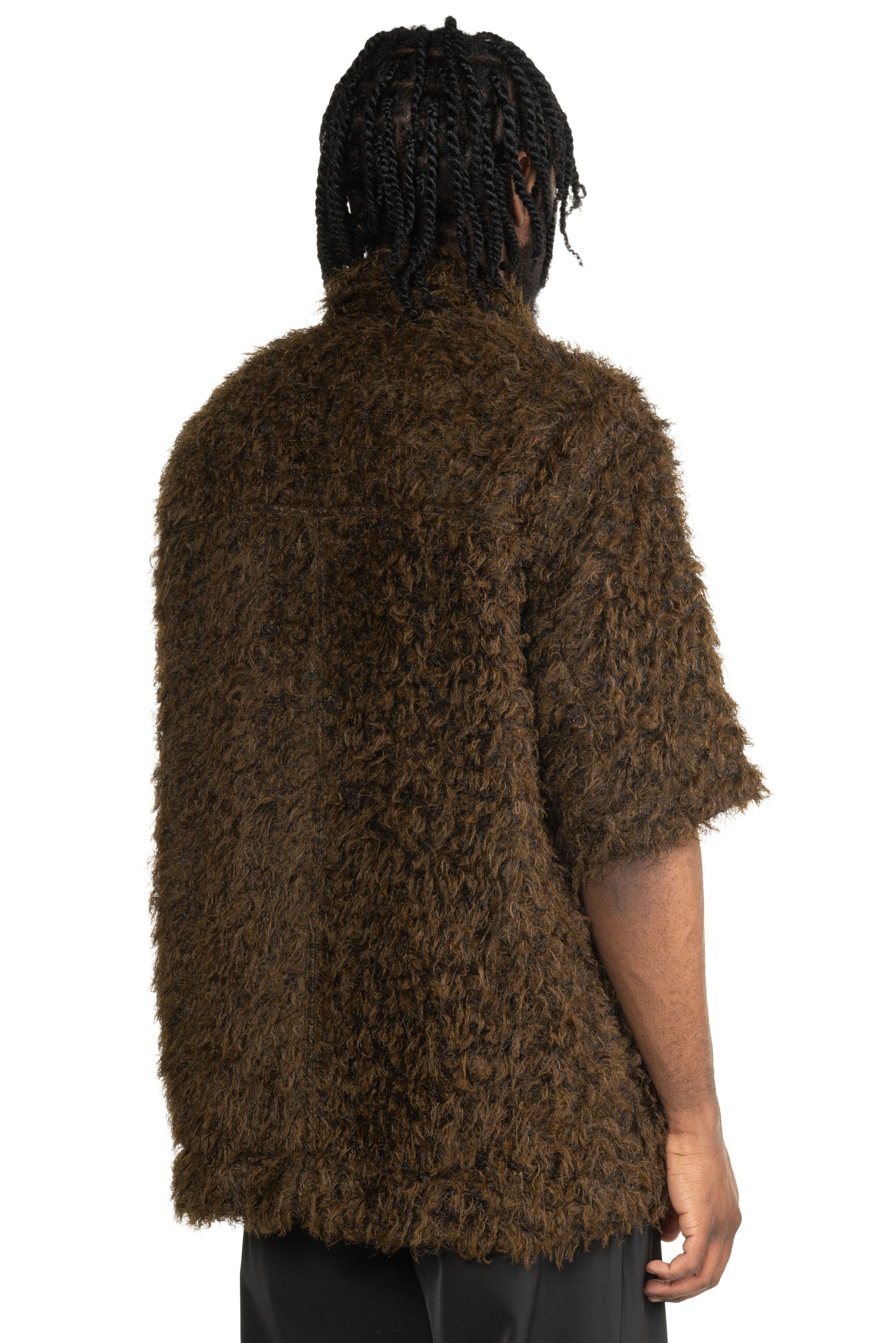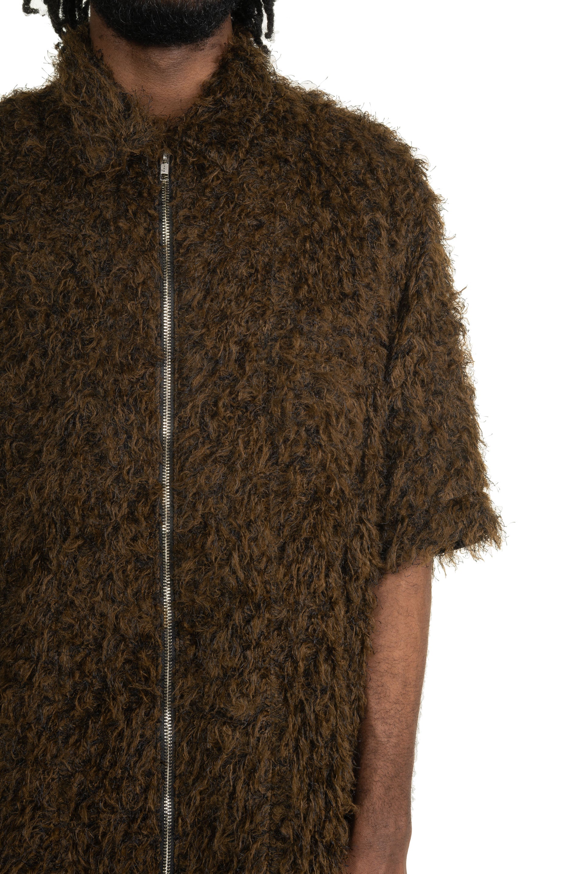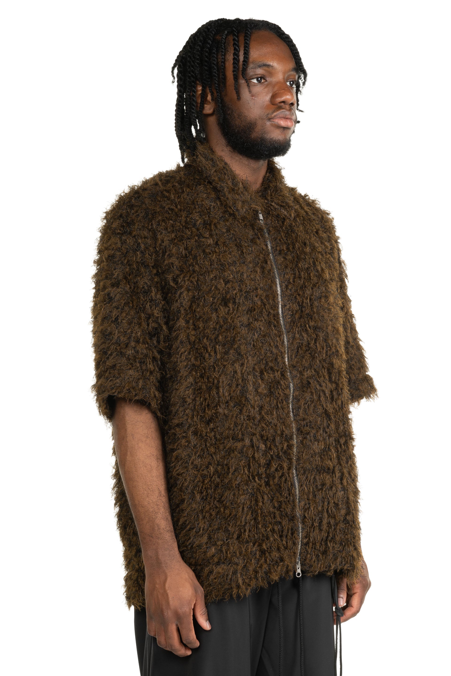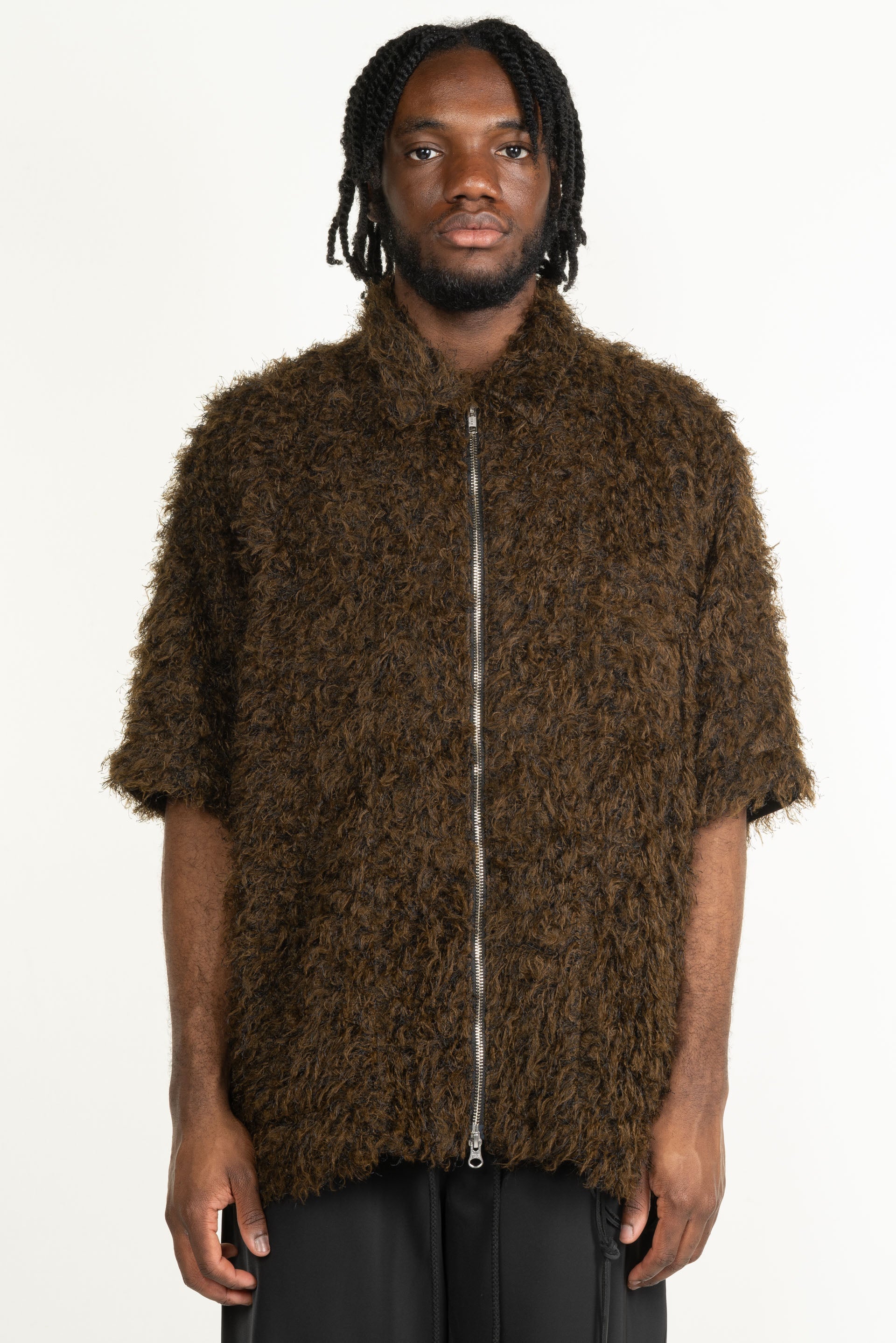 Zip Up Box Shirt Black Brown constructed in a lightweight and soft goat hair wool. Short sleeves. Zip up closure at front.